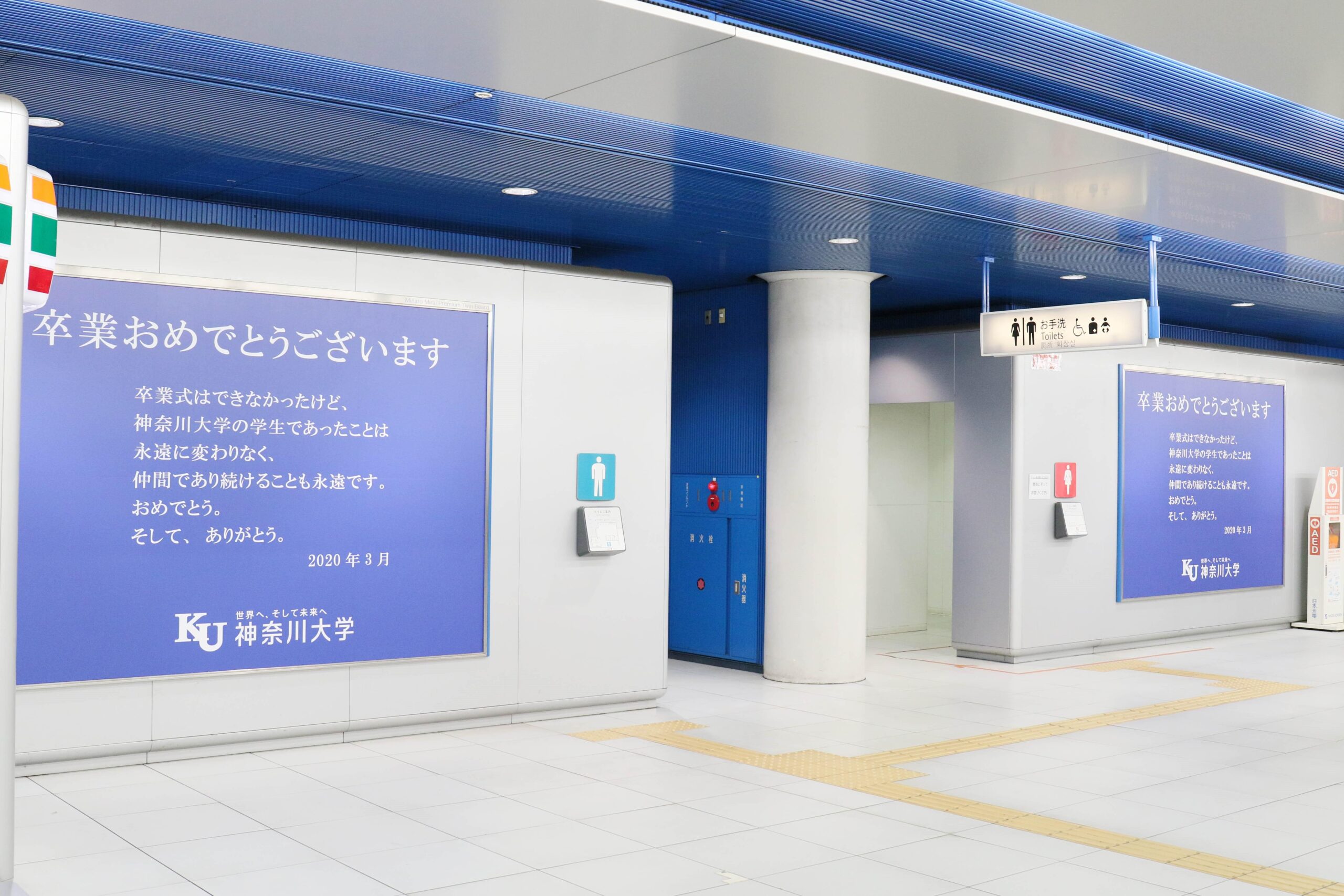 本日3月23日(月)限り、卒業式を開催する予定だったパシフィコ横浜があるみなとみらい線「みなとみらい駅」と「横浜駅」に卒業生のみなさんへのメッセージを掲載。また、本日3月23日(月)の「朝日新聞朝刊(全国版)」に兼子良夫学長からのメッセージを掲載。