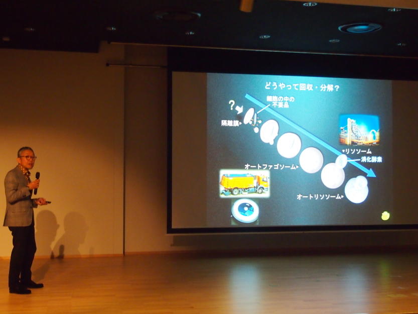 第2部では、大阪大学大学院生命機能研究科・医学系研究科の吉森 保 教授をゲストに招き、「細胞が自分を食べる:オートファジーの不思議」と題して講演いただいた。同教授は、細胞自体が細胞の中の余計なものを取り除いたり、タンパク質などのリサイクルをしたりするシステムであるオートファジーが病気の発生にも関係しており、その研究を推進することで創薬の開発に貢献することができることなどを説明された。