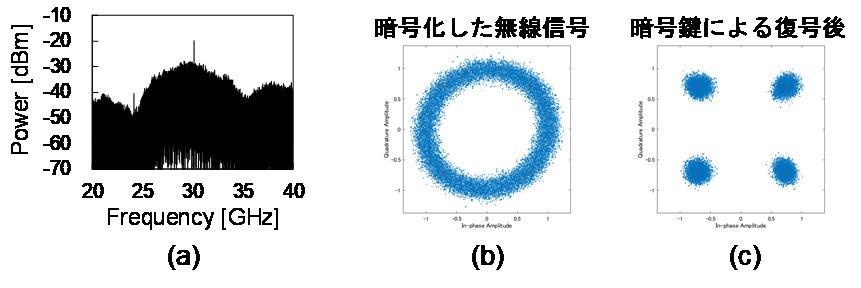 図3(a)に暗号化された無線信号のスペクトルを示します。周波数30GHzを中心としたマイクロ波の信号がヘテロダイン法により発生できていることが確認できます。図3(b)および(c)に受信した無線信号の振幅と位相を示すコンスタレーションを示します。図3(b)に示すように暗号化された無線信号は同心円状に配置されており、その位相をデータとして復号できません。暗号鍵を使った復号化により、図3(c)に示すように、信号点が4点に集約されます。これら4点が00, 01, 10, 11の2ビットのデータに相当するため、正しく復号できます。信号品質は、実用の基準を十分に満たしています。また、このとき、量子雑音による秘匿効果が得られることを理論的に示しました。このように、十分な通信品質と安全性を両立した無線暗号通信システムを実現しました。
