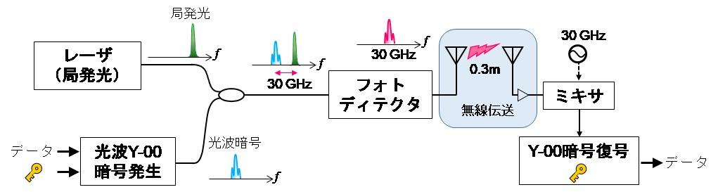 光波Y-00暗号をマイクロ波に変換して無線通信するための実験の構成を図2に示します。12ギガビット毎秒の高速のデータと暗号鍵から、約1550nmの波長にて光波Y-00暗号を発生します。次に、別のレーザから異なる波長の局発光を発生して、光波暗号と合波します。ここで、光波暗号と局発光の周波数の差を無線信号として送出したい所望のマイクロ波周波数に設定します。今回の実験では約30GHzとしました。光ファイバを使って双方の信号をアンテナ近傍まで伝送し、フォトディテクタにより検波します。このヘテロダイン法により30GHzを中心周波数とする12ギガビット毎秒の暗号が発生します。このマイクロ波の暗号を、アンテナを用いて無線信号として送受信します。受信後、高周波ミキサによりベースバンドへ変換し、暗号の復号化を行いました。