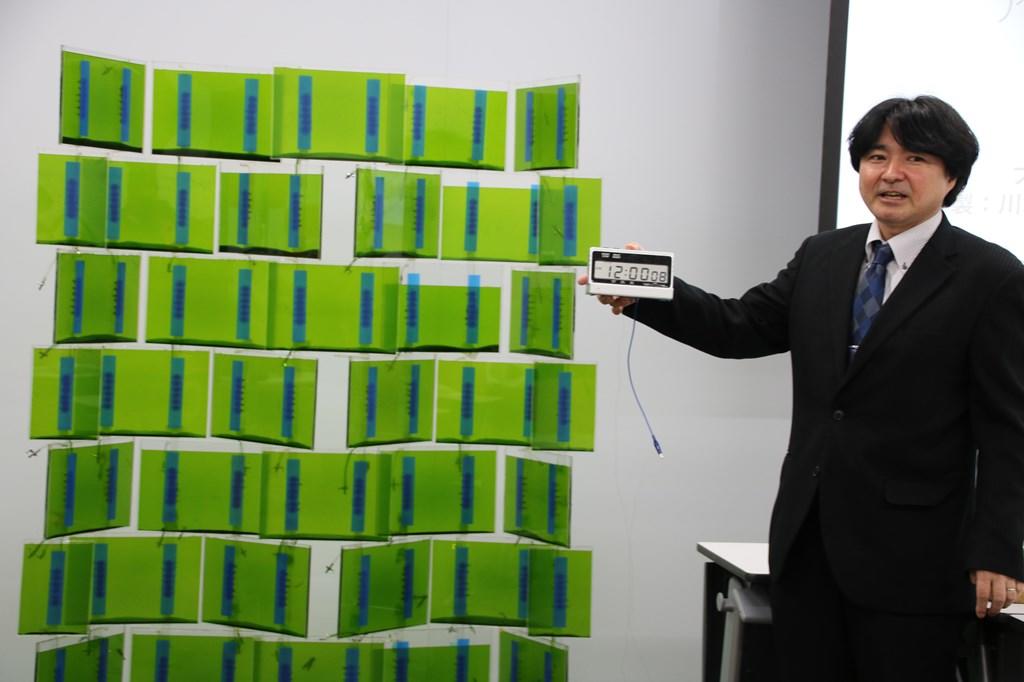 植物の葉緑体には光エネルギーを利用して水を酸素と水素に完全分解する光化学系II複合体(以下PS II)が存在するが、松尾教授はPS IIを含む溶液を燃料に電解質には魚の鱗という廃棄物を利用したバイオ燃料電池を開発した。従来の燃料電池水素極には不可欠な白金触媒を使用しなくても、蛍光灯の光でも発電する優れものだ。この電池をパネルやチューブ状にして屋根や壁、窓などの建築材料に利用できると川上教授が注目し、共同研究につながった。