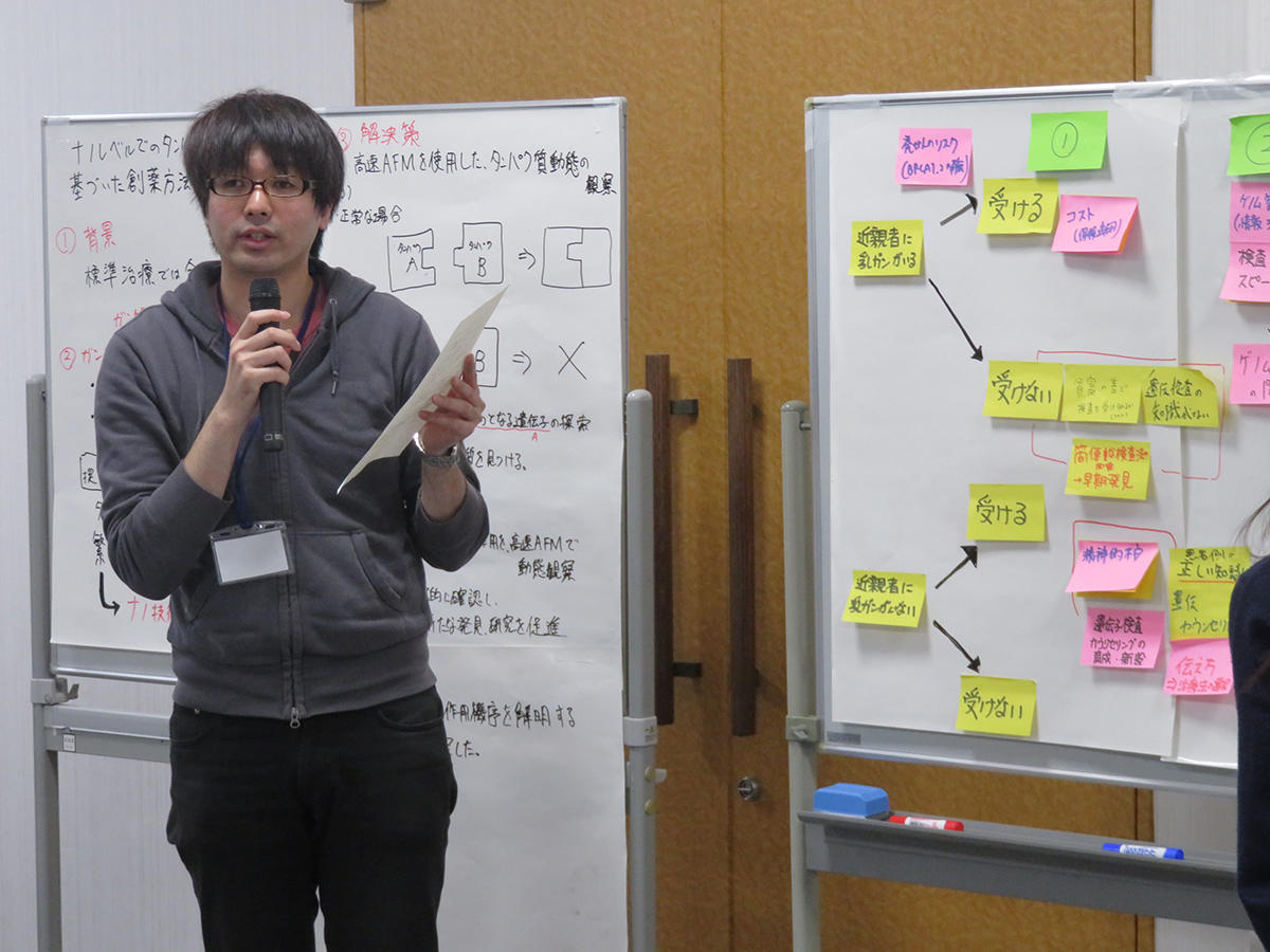2日目は、健康課題解決をテーマにグループワークを実施。合格者、連携先企業担当者および教員が、テーマに関する入学後の異分野融合研究に向けて積極的に議論・質問を交わした。