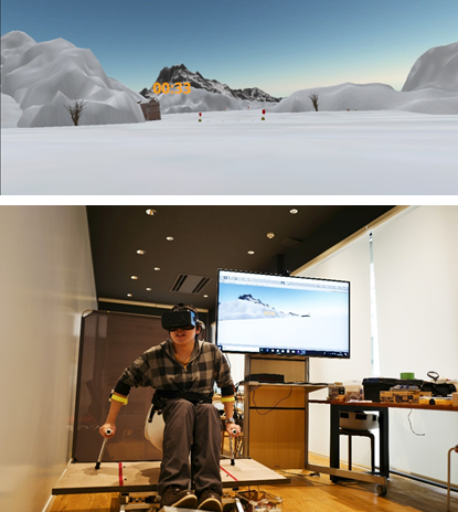 開発されたチェアスキー・シミュレータはチェアスキーコントローラと斜面再現装置から構成されています。ヘッドマウントディスプレイを装着してシートに座り、左右の体の傾きにあわせて仮想空間上の雪原で旋回できるほか、仮想空間の斜面に同期して実空間の斜面再現装置も傾斜するため、より臨場感が味わえます。