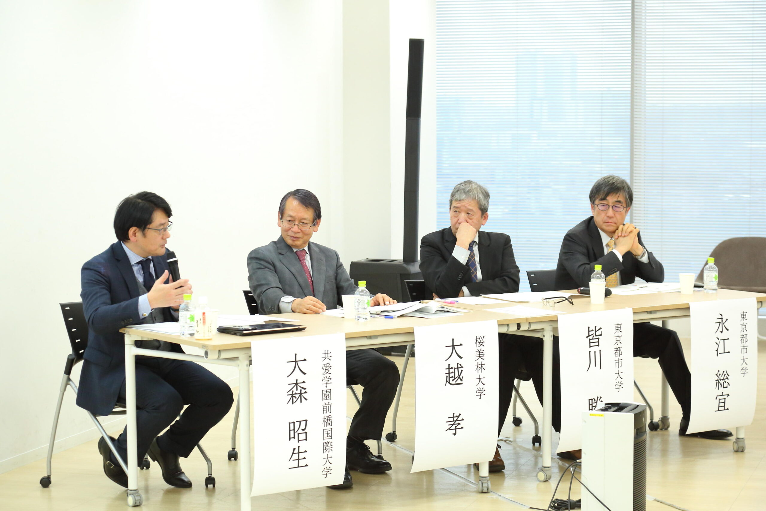 後半は、共愛学園前橋国際大学学長の大森昭生氏、桜美林大学常務理事の大越孝氏をパネリストに迎え、住田曉弘学生支援部部長の進行により「学修成果に基づく学生の成長とそれを実現する教学マネジメント」をテーマにパネルディスカッションが行われた。