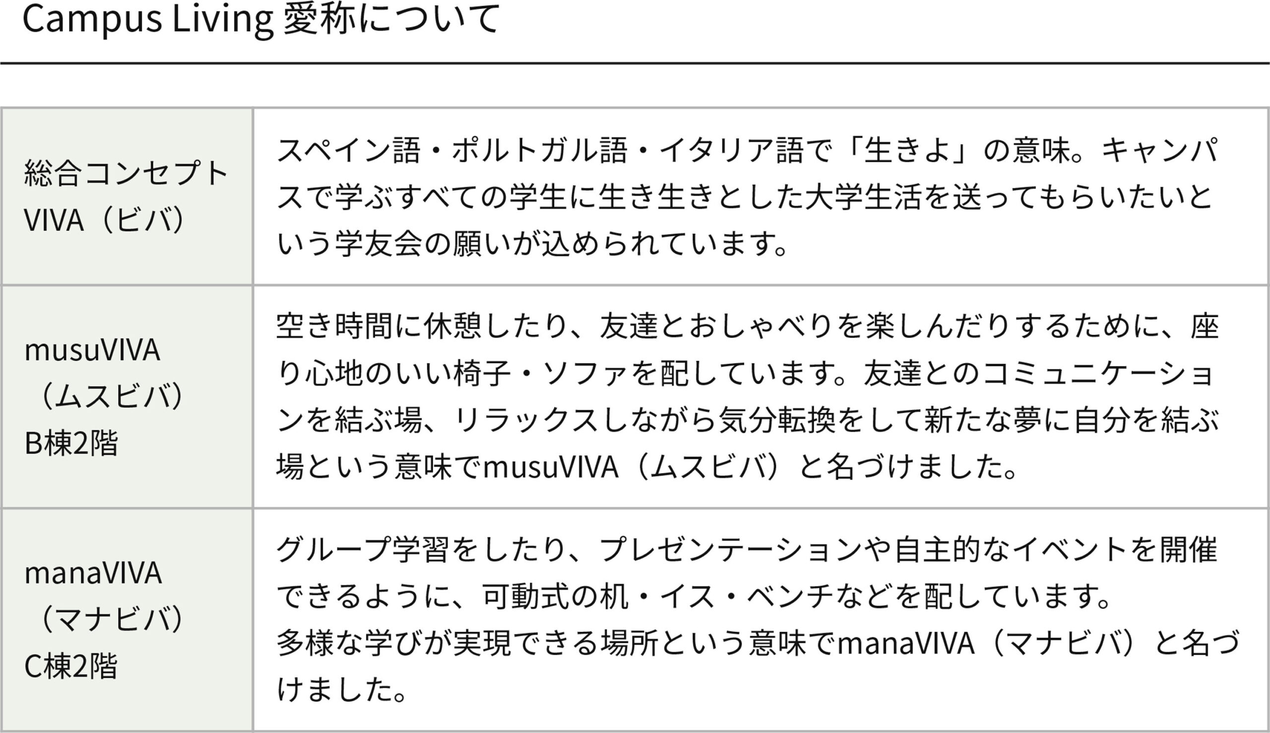 学友会が「manaVIVA(マナビバ)」「musuVIVA(ムスビバ)」と 名づけたこの二つの”居場所”を舞台に、~より高きを目指して~学生 たちが総合コンセプトである「VIVA(生きよ!)」を体現するような 溌剌とした大学生活を送ることを心から願っています。