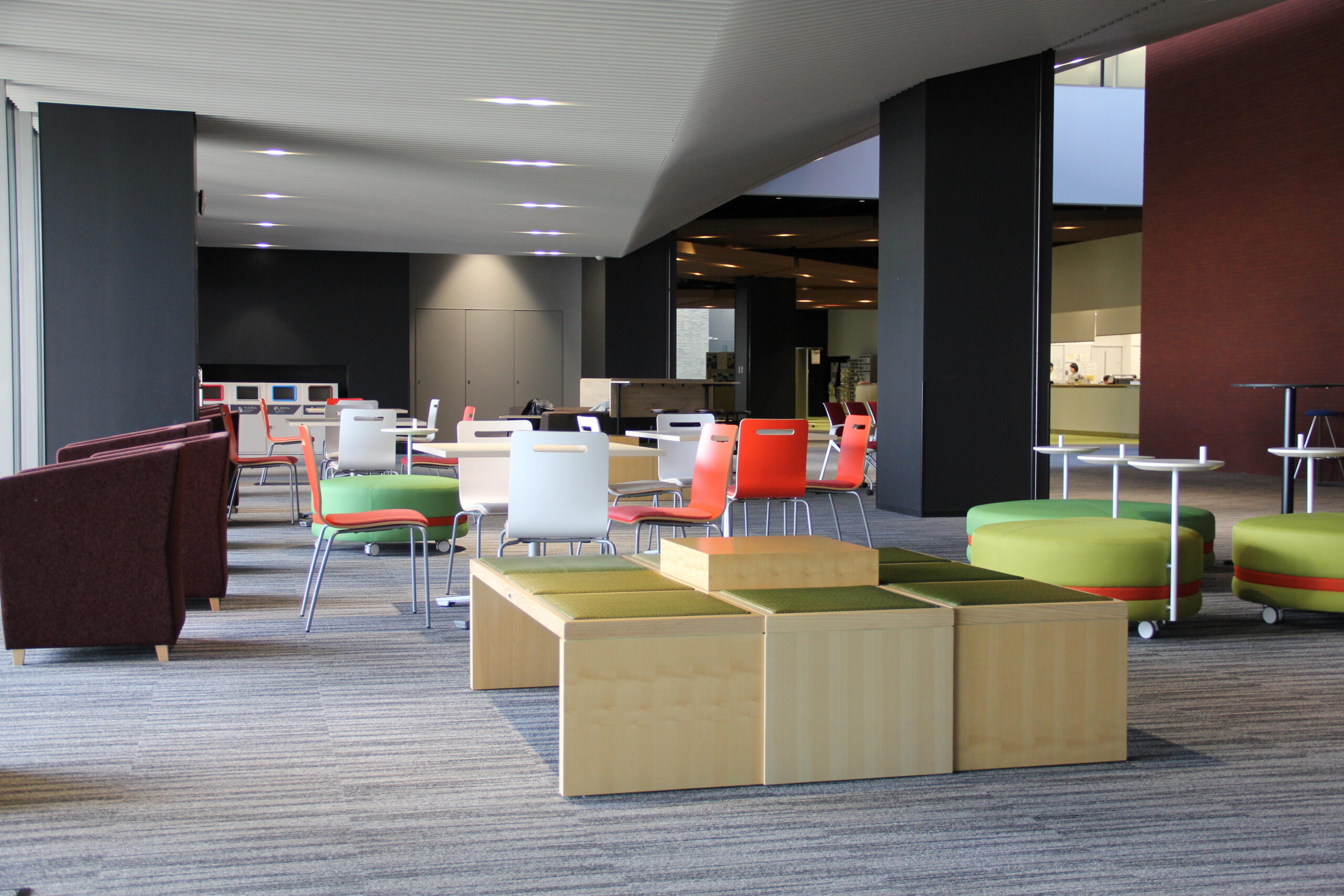 B 棟の Campus Living には「くつろぎ」を目的とする什器を、 また C 棟には時に「学習」、時に「イベント」と環境変化の出来る什器を 導入することで、学生のニーズにそった”居場所”を拡充しました。