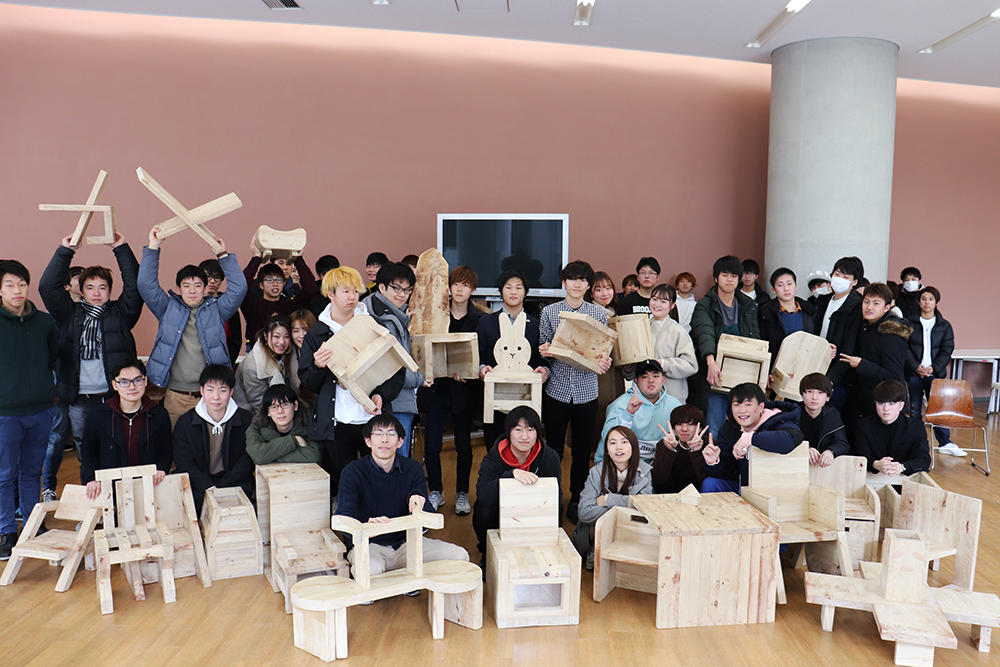 学生たちは園児たちに喜んでもらうために汗を流して制作に取り組み、22脚の椅子が完成しました。