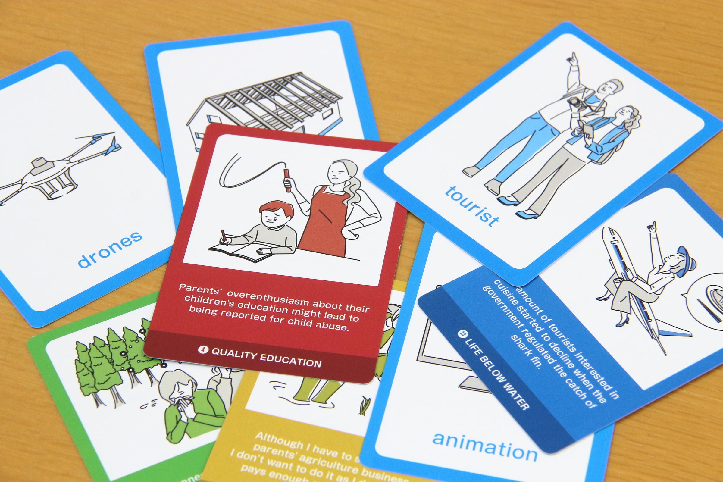 英語版は、日本語版のカードをそのまま英訳したものです。トレードオフカード(全34種類)とリソースカード(全34種類)の2種類のカードにより構成されています。トレードオフカードはSDGsの17の目標達成に向けて想定される「トレードオフ」と呼ばれる課題が描かれており、リソースカードには課題解決に使えるAIやロボットなどの技術や製品、サービス等のアイテムが描かれています。