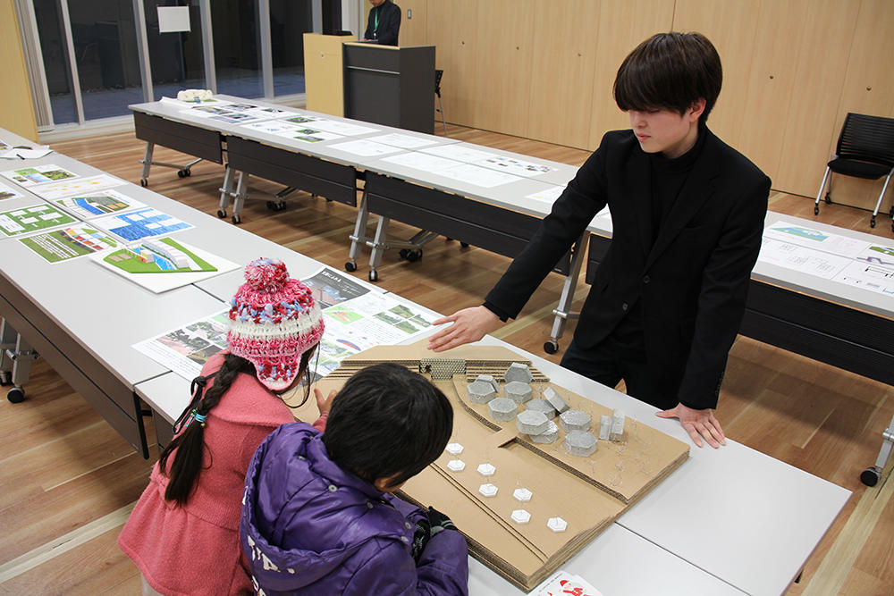 付近にある古墳にヒントを得て、遺跡のような外観の住宅を考案した武田剛さん(建築学科2年生)は、実際に建築現場で使われるモルタルを使って住宅模型を製作。古墳から出土した六角形の鏡にちなんで住宅やベンチ、防音壁などに六角形のデザインを取り入れ、訪れた子どもたちの興味や関心をひいていました。将来は建築家を目指している武田さんは「建築物は人から愛されることで長く住まわれ続けることができます。自分は将来、周囲に溶け込める建築物を作っていきたいです」と語っていました。