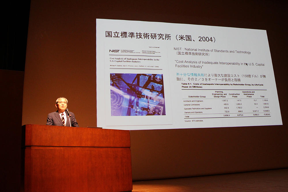 続いて、安井建築設計事務所ICT室の戸泉協氏が登壇。飯島教授の解説をベースにBIMの具体的な活用事例を紹介しました。「BIMを活用すればその建物における環境(風向きや汚染物質の拡散、景観など)のシミュレーションが可能となり、動画も作成可能です。これからは発注者さんもBIMが利用できるように、私たち設計務所も提案をしていきたいです」と期待を込めていました。