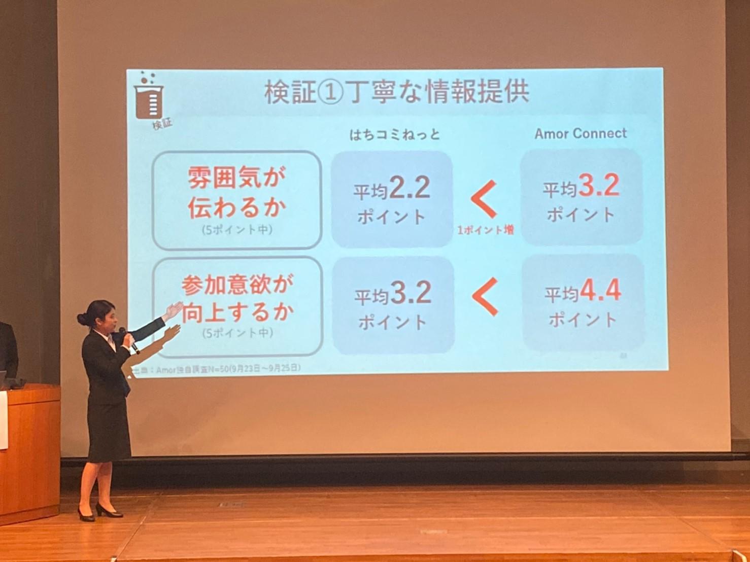 市政提案部門にて最優秀賞に輝いた安田ゼミのチームAmorは「誰もが地域とつながりを持てる社会へ」をテーマに、八王子市が高齢者の社会参加を促すさまざまな取り組みを行っているものの、それらが必ずしもうまくいっていない点に着目。その中でも、行政が運営する社会参加を促すサイト(はちコミねっと)の改善提案を利用者ならびにコミュニティ、行政へのヒアリング調査に基づいて発表した。