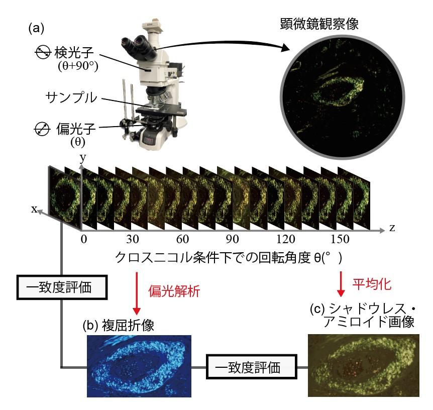 【(a) 実験の光学系、偏光子と検光子のクロスニコル条件下で得られる光強度分布、(b) 二重回転消光子法で得られる複屈折像を基準として、(c) シャドウレス・アミロイド画像を平均化から得ます。複屈折像を真値として一致度評価を行いました。】