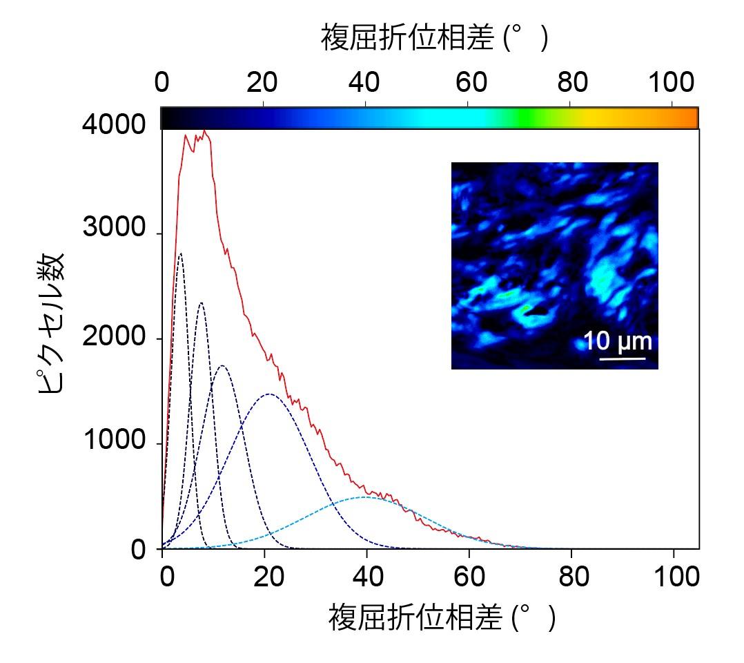 また、二重回転消光子法の結果で得た複屈折像を丁寧に解析してみると、図4に示すように複屈折位相差のヒストグラム中に複数のピークが得られることがわかりました。複屈折位相差が10°、20°、そして40°の位置にピークスペクトルが見つかりました(図4)。10°近傍で見られるピークはアミロイド沈着物の弱い分子配向に対応します。20°と40°の遅延でのピークは、それぞれアミロイド沈着物の中程度の分子配向と強い分子配向を表しています。