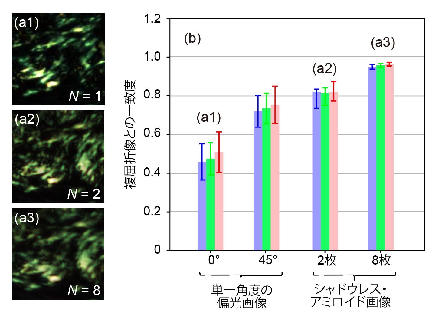 【(a1) θ = 0°の単一角度における偏光画像、(a2) 2枚の画像を平均化することで得られたシャドウレス・アミロイド画像、8枚の画像を平均化することで得られたシャドウレス・アミロイド画像。(b) それぞれの画像と複屈折像の一致度の比較結果。】