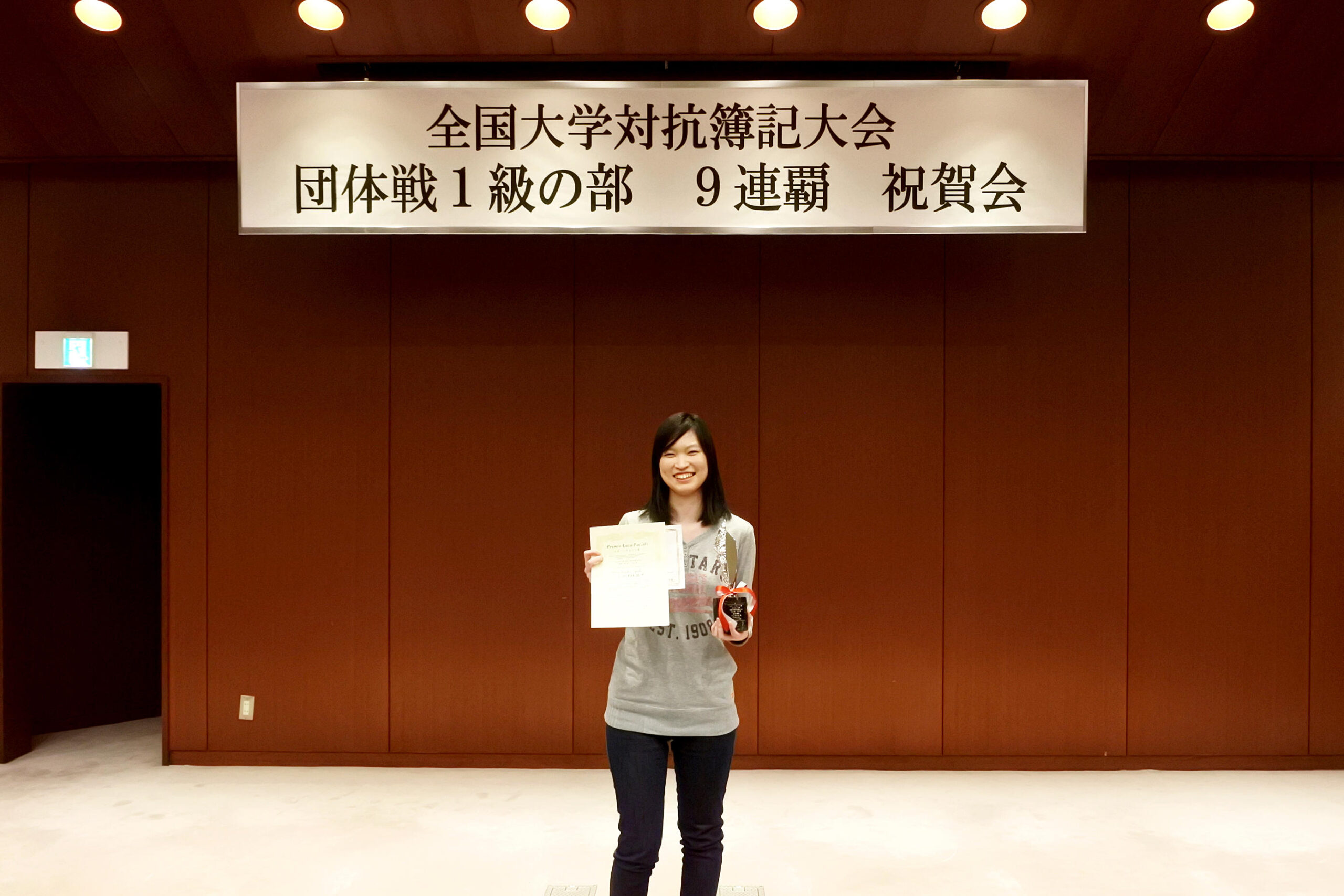 同大では、12月4日(水)に祝賀会を開催。原科学長からトロフィーや賞状が手渡され、学生たちの偉業を称えた。個人戦1級の部で全国1位に輝いた小口紗矢佳さん(商経学部商学科2年)は「優勝できたことにとても驚いています。くじけそうになったことも何度もありましたが、こうして今までの努力が結果として現れたことを嬉しく思います。休みなく勉強し続け、日商簿記1級合格を目指して頑張ってきました。これからもより一層励んでいきたいと思います」とコメントした。