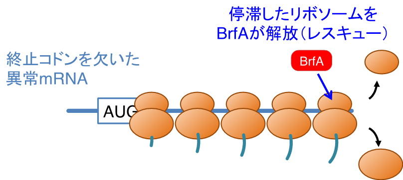 今回、異常なmRNA上で、翻訳を終結できずに停滞してしまったリボソームを解放(レスキュー)する新たな因子として、グラム陽性菌に分類される枯草菌から、BrfAというタンパク質を発見した。翻訳終結は、リリースファクター(RF)と呼ばれる因子が終止コドンを認識することで起こるが、BrfAは、終止コドンがない状況でもRFを活性化し、異常mRNA上で停滞したリボソームを解放することが分かった。RFに依存したリボソームレスキュー機構は、これまで、グラム陰性菌に分類されるごく一部の細菌においてのみ知られていたが、今回の研究から、グラム陰性菌とは分類学上近縁ではないグラム陽性菌の仲間にも、非常に類似した仕組みが進化の過程で備わっていたことが明らかとなった。