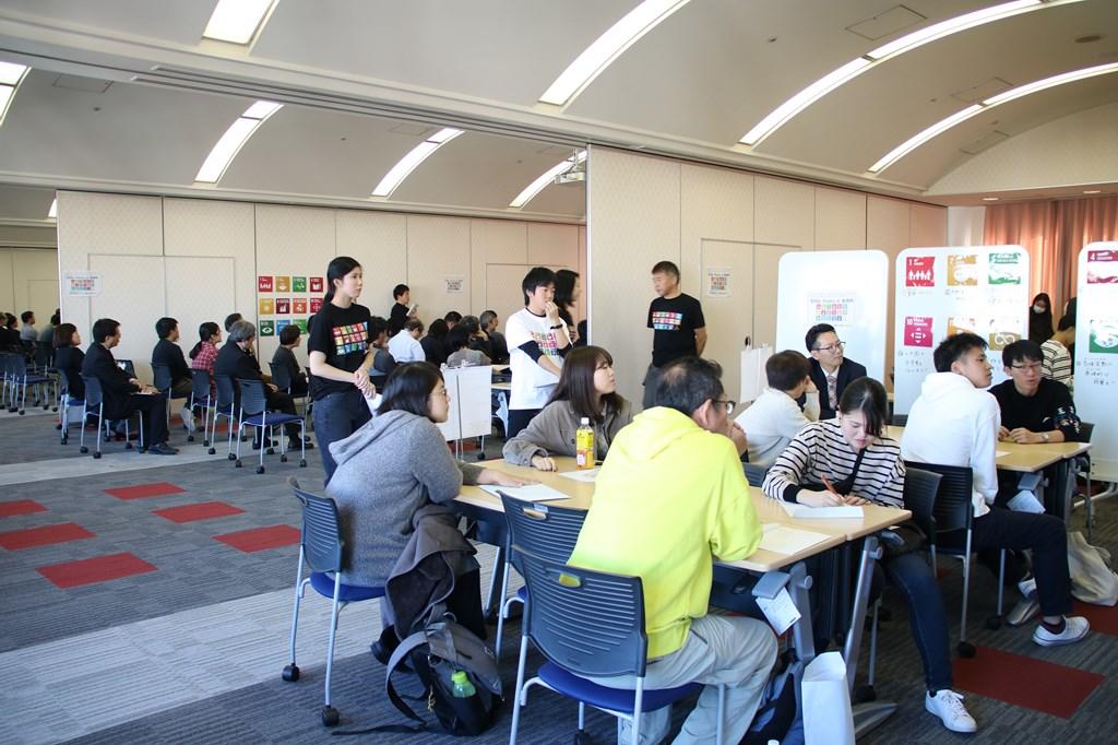 基調講演後のグループワークでは、参加者が「Business」「Academic」「Citizen」「Kid’s Challenge」の4つに分かれ、企業の実際のSDGsに対する取り組み紹介や教育・研究の事例報告、カードゲームを通じた世界の社会・環境・経済の課題解決の考察、クイズで楽しみながら日常生活とSDGsのかかわりを学ぶなどあらゆる角度でSDGsを考え、理解を深めた。「Kid’s Challenge」コーナーで進行役を務めた水西俊登(たかと)さん(経済学科3年)は、「スーパーでの買い物にエコバッグを使うなど、自分の身のまわりでできることからSDGsを意識しています。将来は教員を志望しているので、模擬授業にSDGsを取り入れるなど子供たちにも理解を広げていきたいです」と意欲を示した。