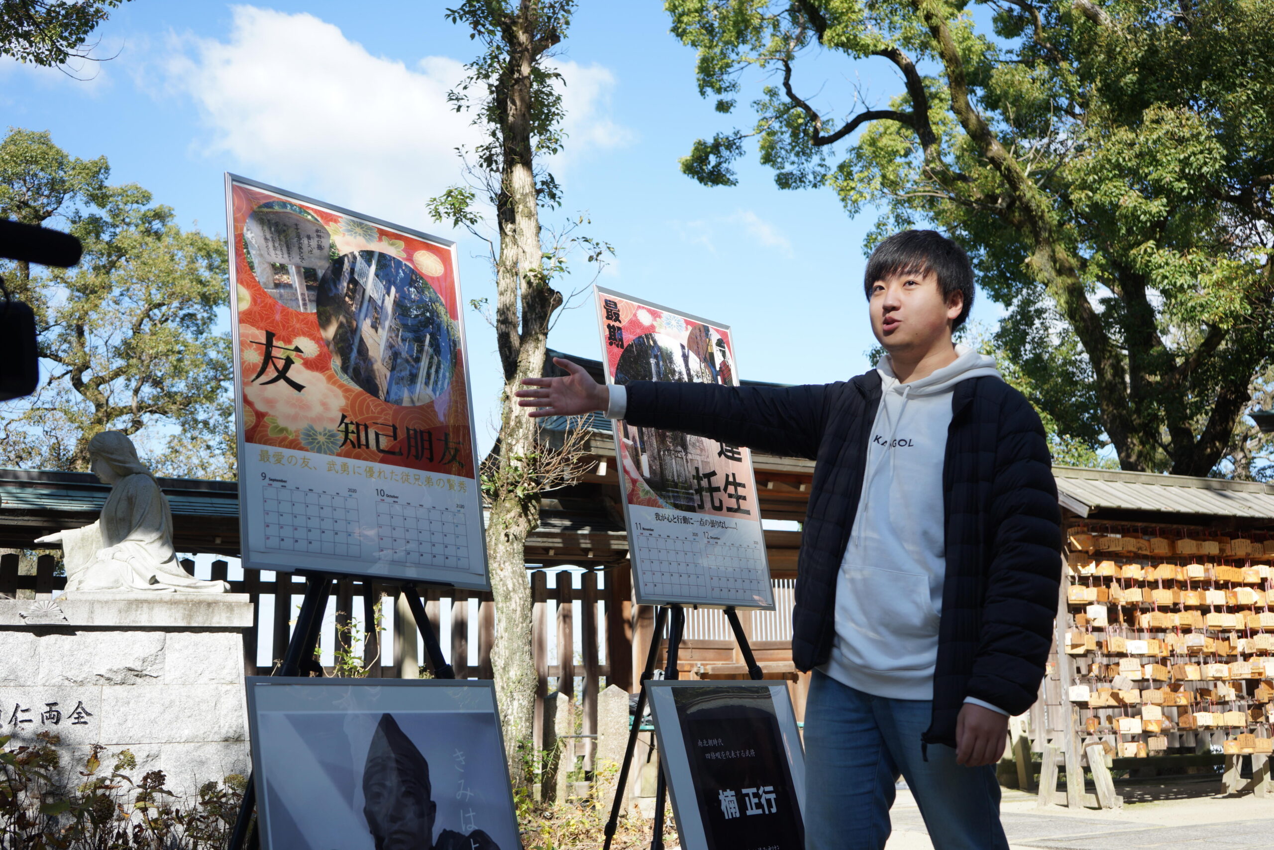 ポスター兼カレンダーを制作した同学科3年の島本翔平さんは「最初は楠正行のことを知りませんでしたが、学んでいくうちに深い博愛の精神に感銘を受けました」と振り返っていました。