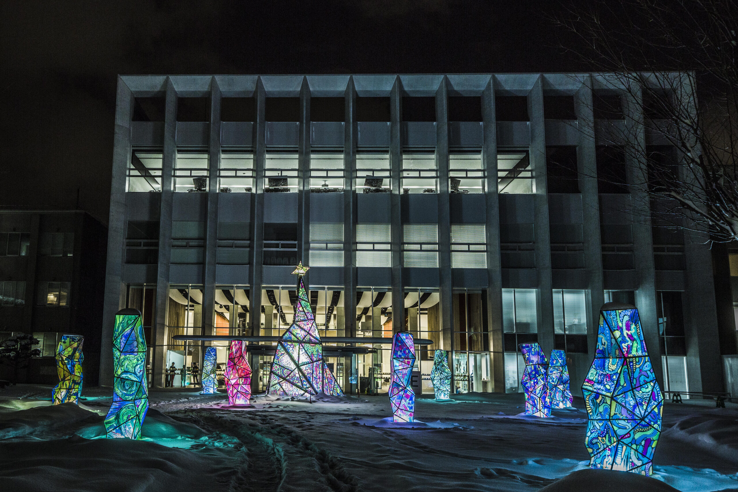 HUSキャンパスイルミネーションは、2017年に開学50周年を記念して初開催したもの。ステンドグラスアーティストMie(本学客員教授)がプロデュースするオリジナルイルミネーションで、高さ6mのメインツリーと14本の光のオブジェがキャンパス内を彩ります。また今年は新たな試みとして、日本を代表する万華鏡作家依田満・百合子夫妻が手掛ける投影型万華鏡を校舎壁面等に投影します。