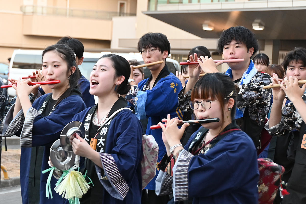 土手町コースで行われた本番の運行では、学生や留学生、教職員、役員など多くの大学関係者が参加。夜の街に鳴り響く「ヤーヤドー!」の掛け声と勇壮なねぷた囃子が、弘前の夏を一層盛り上げた。
