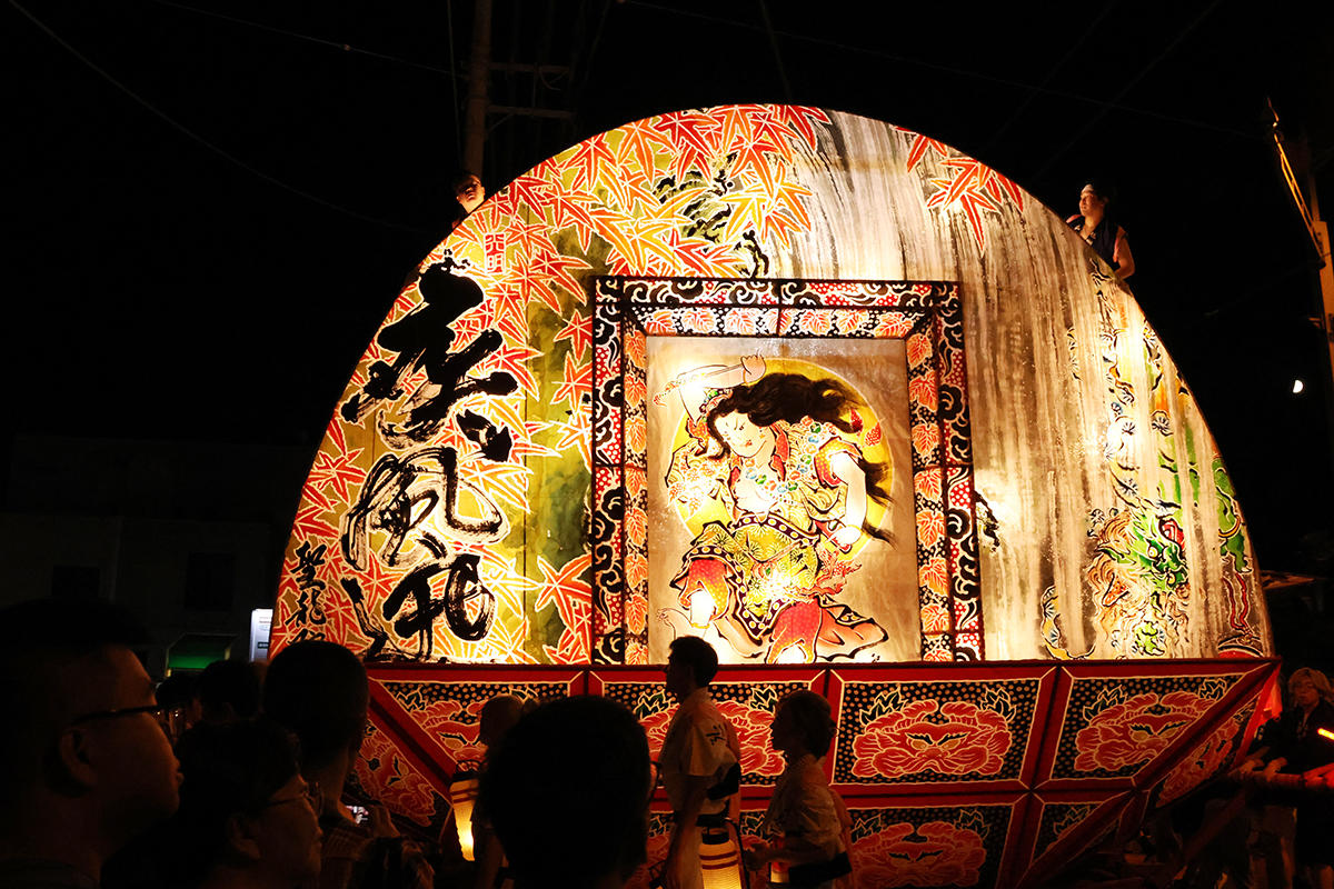今回の大型ねぷたの絵は、ねぷた絵師・聖龍院龍仙氏が手がけたもの。「三国志」を題材に、飛刀の名人とされた祝融夫人と、その夫・孟獲がともに戦う場面が描かれ、色鮮やかで迫力ある作品に仕上がった。
