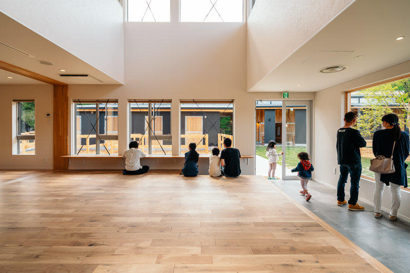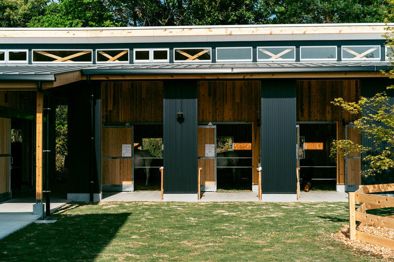 滋賀県栗東市に建設された本施設は、引退した競走馬の厩舎であるとともに、地域の子ども達と馬が触れ合う福祉施設という2つの目的を複合した日本初の空間である。「馬が快適になることが、人の快適につながる」という理念のもと、馬が過ごす馬房の環境性能向上に取り組んだ。構造体にCLT(板の方向が層ごとに直交するように重ねて接着した大判パネル)を用い、多くの木材を使うことで木が有する断熱、蓄熱性を最大限に活用している。暑さに弱い馬の身体特性を考慮し、屋根、壁からの日射を制御するために、外装材として鋼板を貼りCLTの構造体を保護しつつ通気層を確保している。