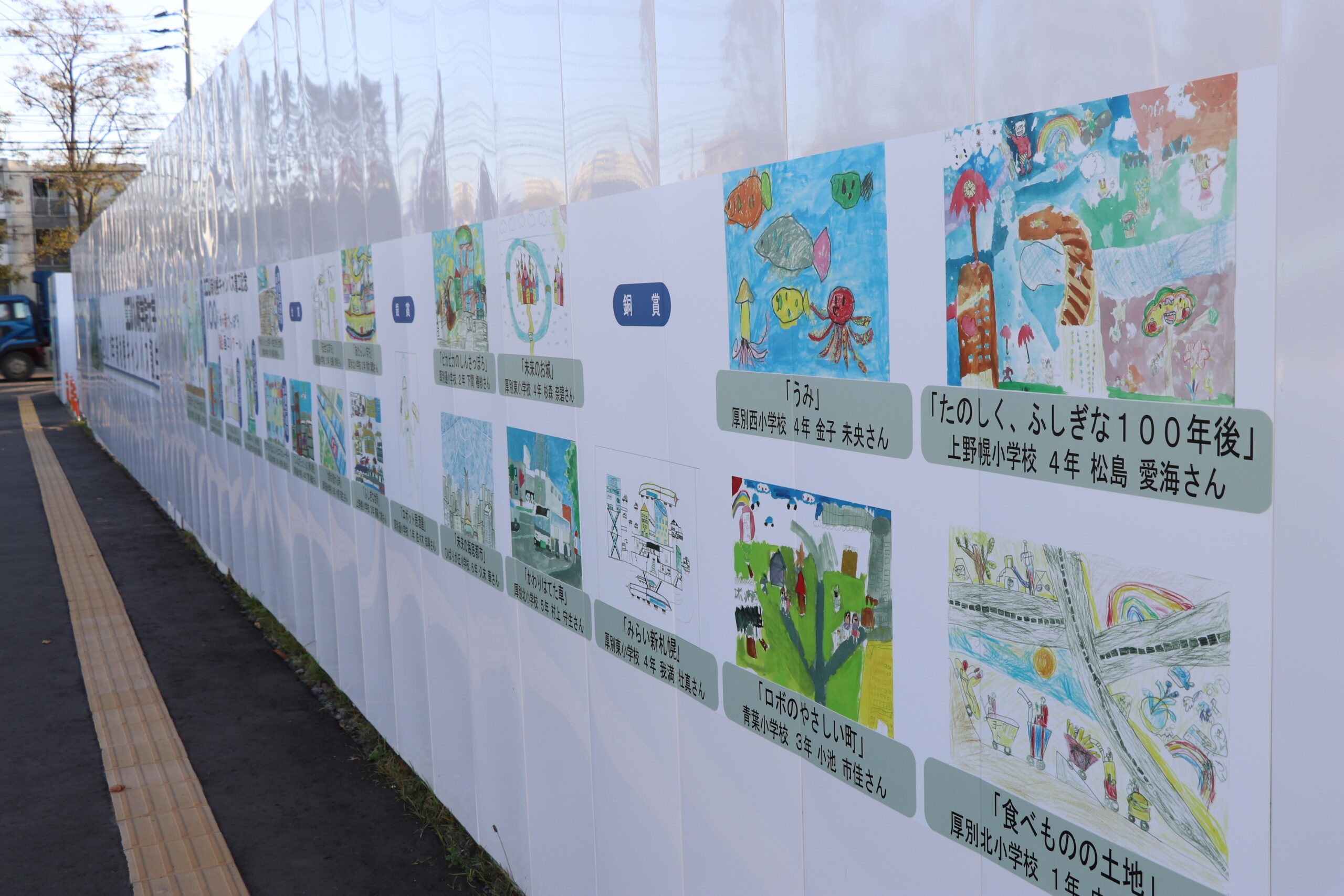 入選作品は2019年10月末から約1年間、工事中の校地を囲う仮囲いに掲出する。これは、新キャンパスに工事期間中から触れ、親しんでもらうためのもの。厚別区の子どもたちが「100年後の新さっぽろ」をイメージして描いた絵画が鑑賞できる。