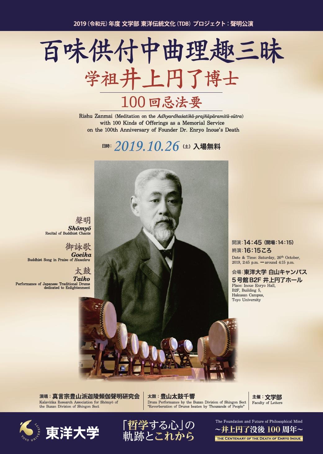 東洋大学が10月26日に創立者・井上円了の没後100周年記念「円了Day」として講演会と聲明公演を開催
