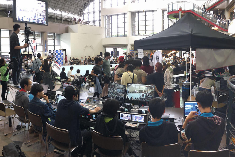 今回、中継を行った「電chu!」のメンバーは総合情報学部の学生16人。鋭く高いキックや目にもとまらぬ速さのツイスト(ひねり技)など、躍動感あふれる激しい技を次々と繰り広げる選手たちの動きを抜群のチームワークとカメラ操作で追っていました。