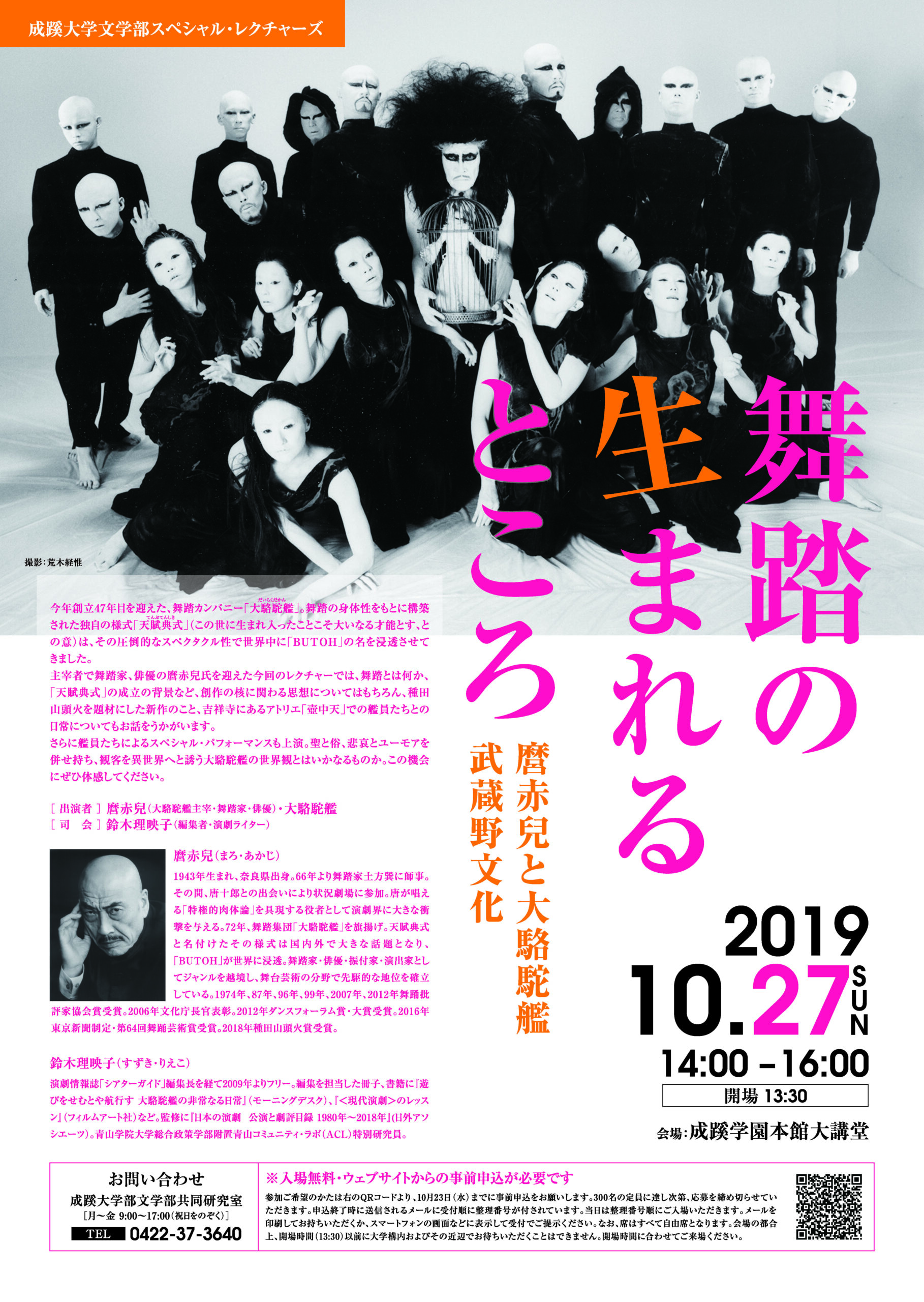 成蹊大学文学部は、2019年10月27日(日)に公開講演「舞踏の生まれるところ ―麿赤兒と大駱駝艦 武蔵野文化―」を開催する。舞踏家で俳優の麿赤兒氏と氏の主催する舞踏集団「大駱駝艦」を迎え、舞踏とは何か、「天賦典式」の成立の背景といった創作の核に関わる思想や、吉祥寺にあるアトリエ「壺中天」での艦員たちとの日常などについてお話を伺う。また、艦員たちによるスペシャルパフォーマンスも上演の予定。