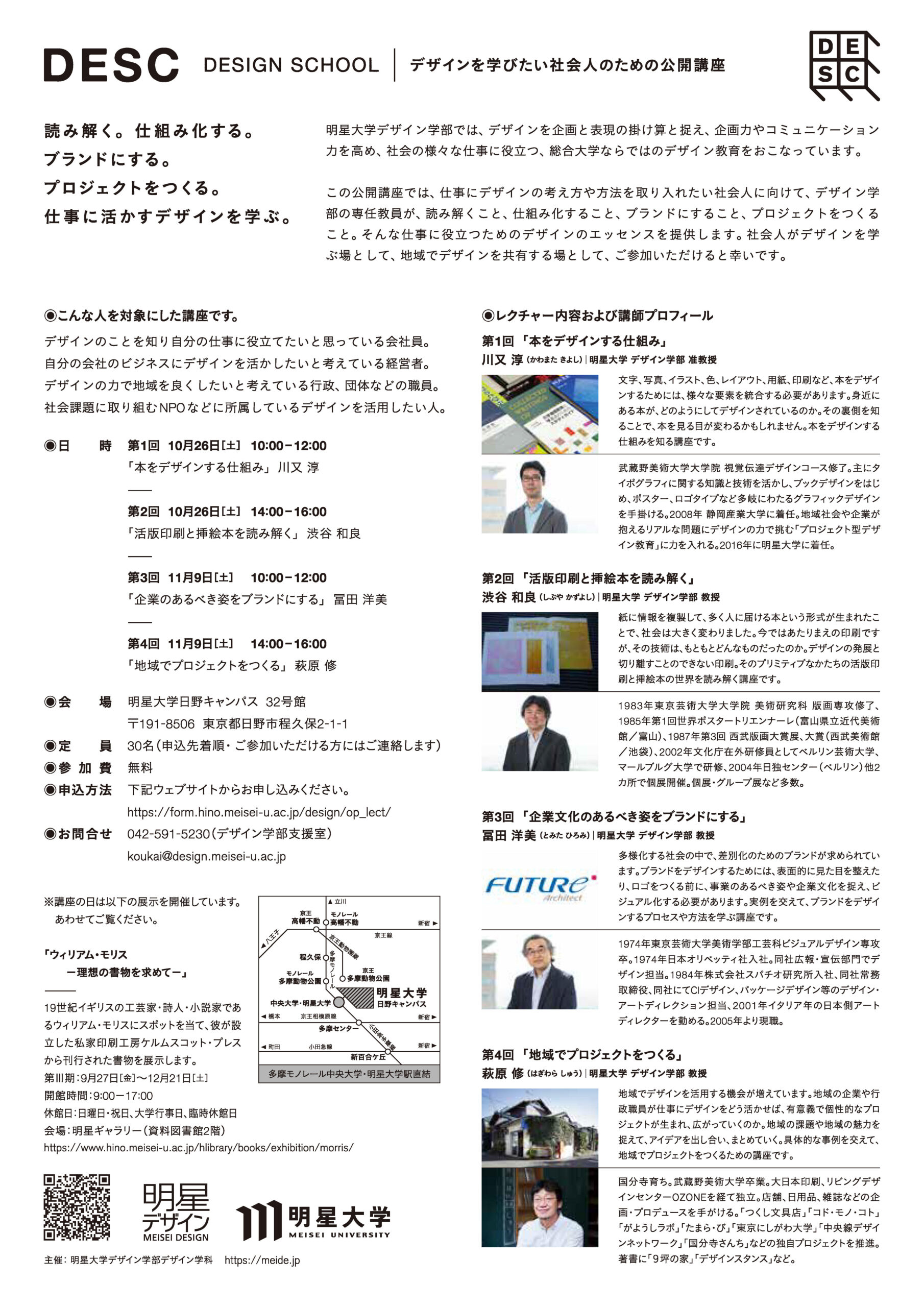 明星(めいせい)大学(東京都日野市)デザイン学部は、デザインを学びたい社会人のための公開講座「DESC(DESIGN SCHOOL)」を開催します。