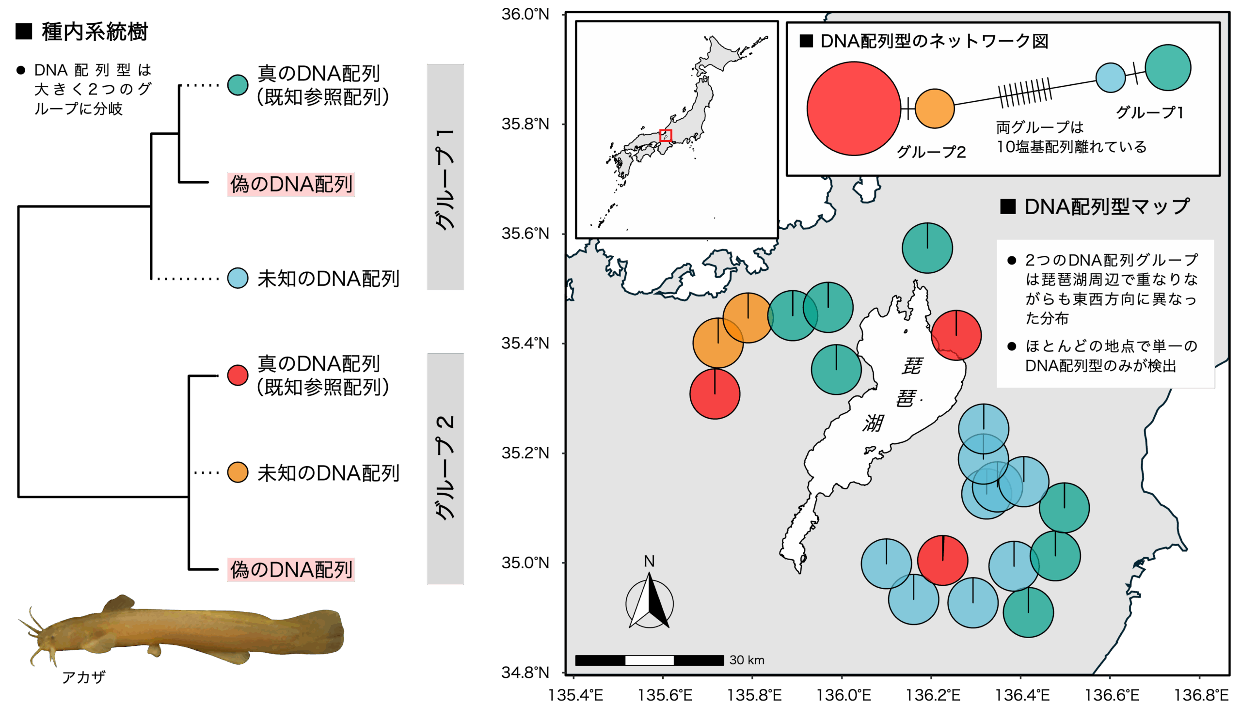・応用事例として、河川の魚類環境DNAを網羅的に調べた「メタバーコーディングデータ」に本手法を適用し、複数魚種のDNA配列を選別・抽出。種内の遺伝的多様性の知見があるアカザについて、既存の知見と一致するパターンを確認するとともに、未知のDNA配列を検出