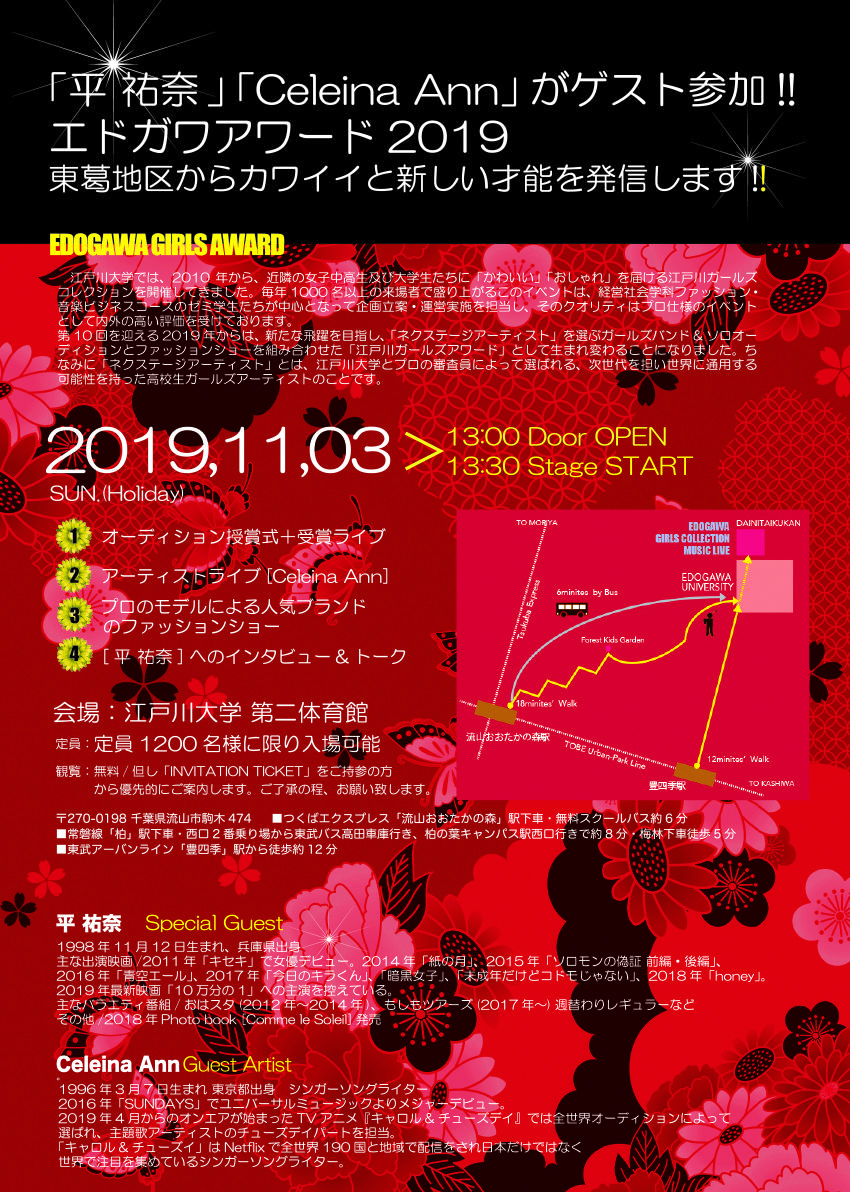11月3日(日・祝)の「江戸川ガールズアワード2019」では、「ネクステージアーティスト」の表彰式および受賞者によるライブをはじめ、シンガーソングライターCeleina Annさんのライブやプロのモデルによるファッションショーを実施。また、特別ゲストとして女優の平祐奈さんを招き、トークショーを行う。概要は下記の通り。