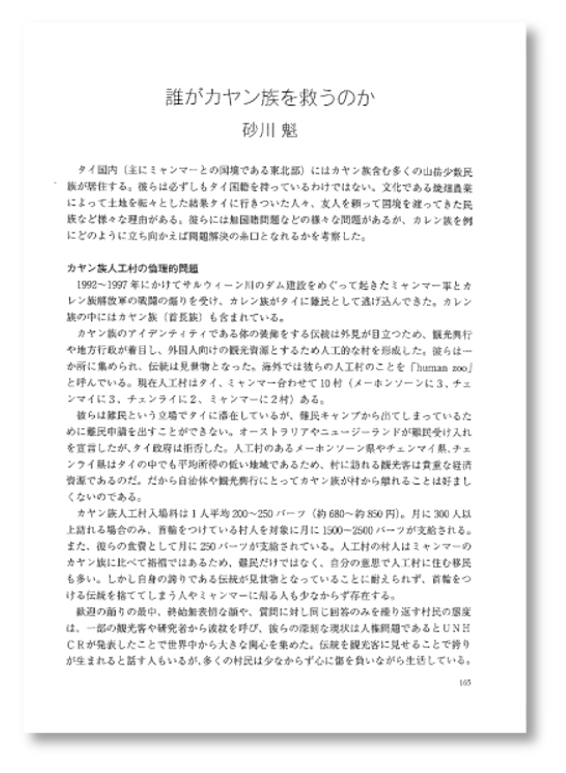 タイ研修旅行レポート集は2010年度より発行しています。2019年度に発行したレポート集「南北回廊を北上せよ」では、これまで以上にレポート作成のプロセスを充実させました。社会で起きている事柄を公平・公正に捉える視点を養うことを目指し、校内合宿を実施して生徒一人ひとりの興味関心を元にレポートの「論点」や「切り口」を整理。結果として、「経済や国籍」の問題に限らず「麻薬」「ゴミ問題」「LGBT」「ジェンダー」をテーマに取り上げる生徒が増え、SDGsにもつながる広がりを持った一冊(A5判、202ページ)となりました。