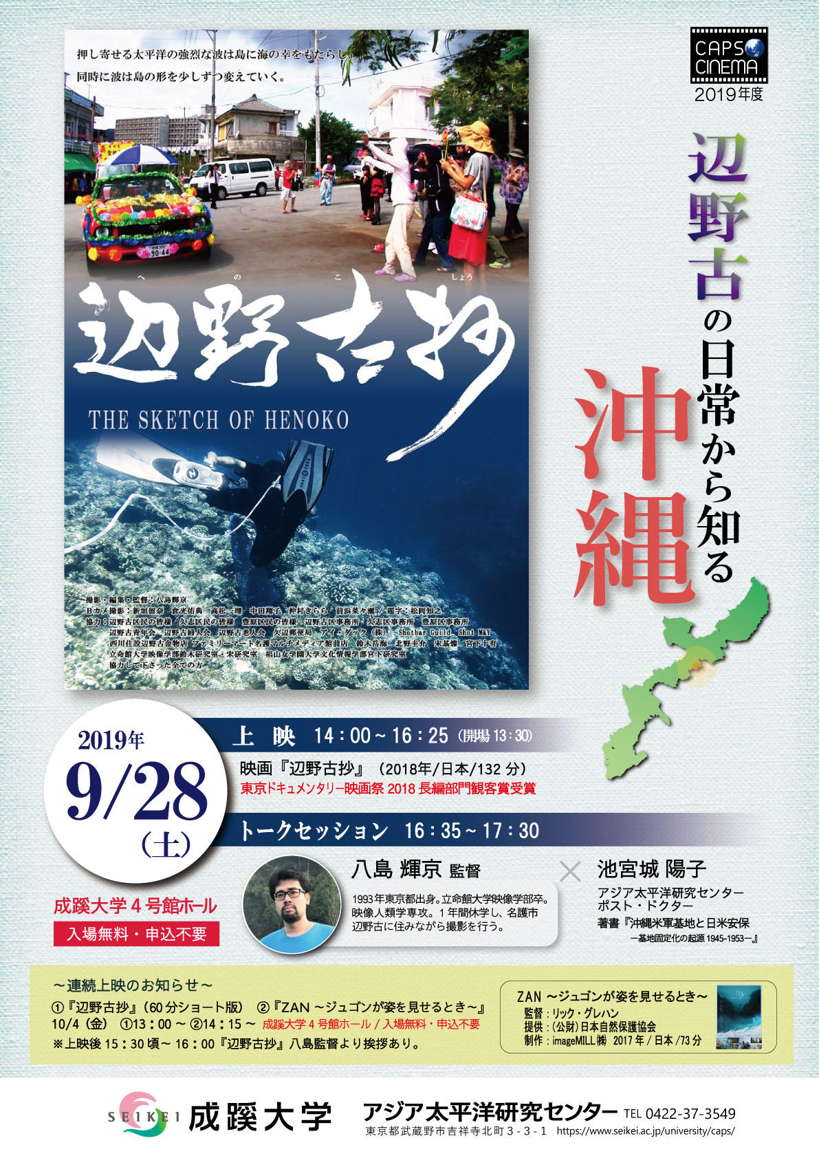 成蹊大学(東京都武蔵野市、学長:北川浩)は、2019年9月28日(土)と10月4日(金)に「辺野古の日常から知る沖縄」をテーマに『辺野古抄』と『ZAN~ジュゴンが姿を見せるとき~』の2作品上映および監督トークを開催する。