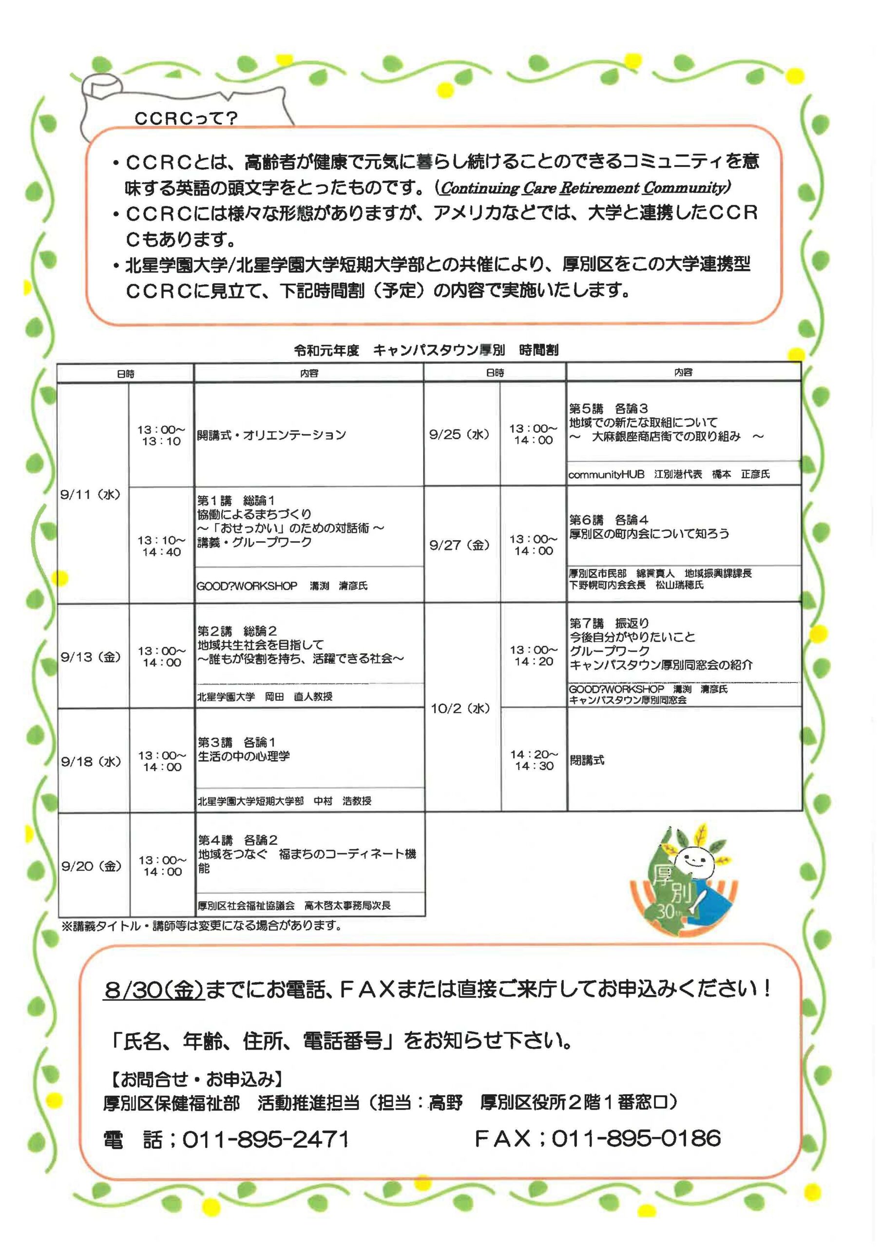 厚別区では北星学園大学/北星学園大学短期大学部とコラボレーションし、厚別区版大学連携CCRC「キャンパスタウン厚別~おせっかいやきになろう!~」を実施。町内会や地域福祉に関する講義やグループワークを通して、高齢社会に向けた地域活動の担い手を創出する。