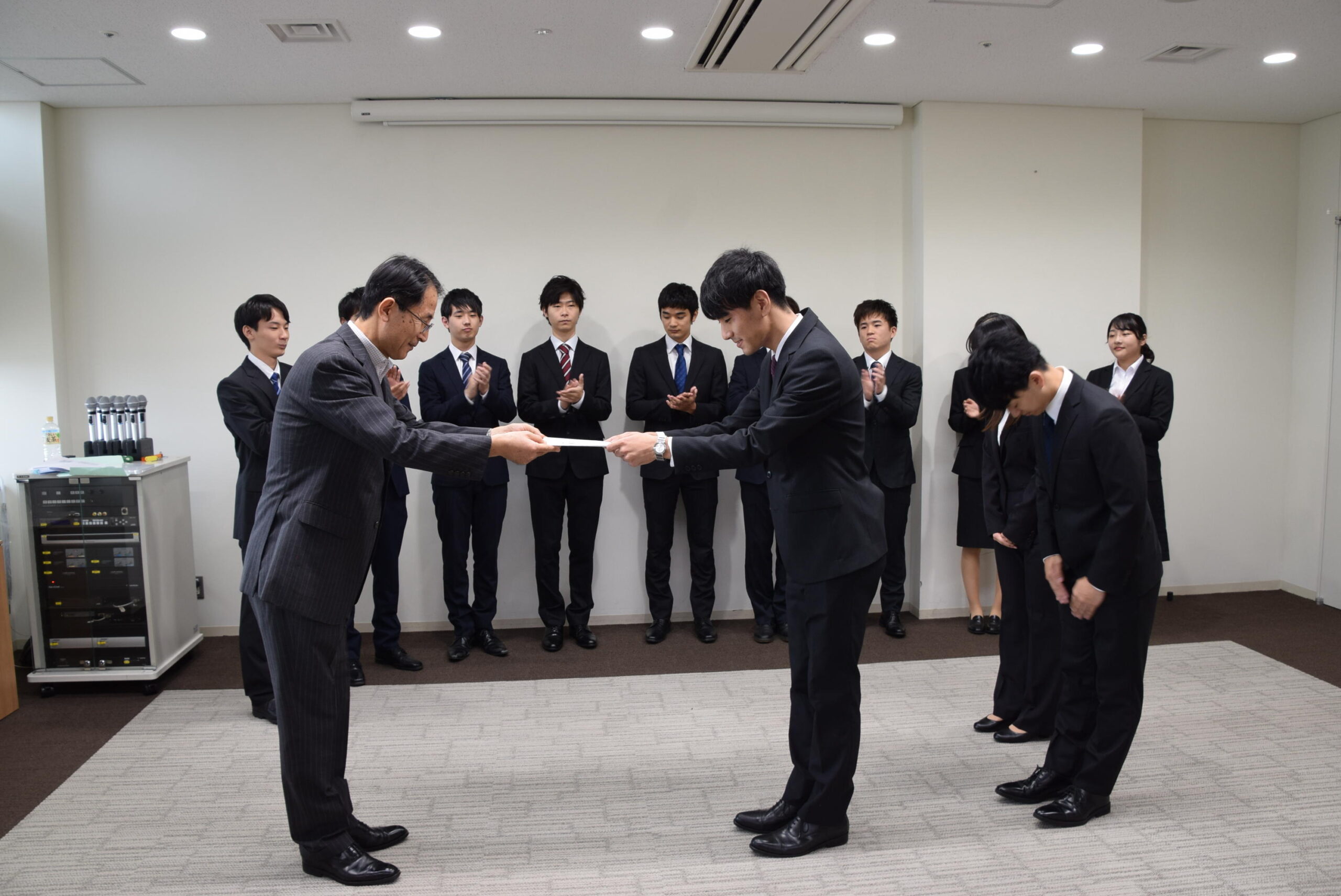 表彰式は8月26日(月)に本学で行われ、日本経済学教育協会事務局から優勝した「経済学理論同好会Aチーム」の後藤佑太さん(経済学部3年)、準優勝した「経済学理論同好会Bチーム」の東口和正さん(経済学部2年)に賞状が手渡されました。