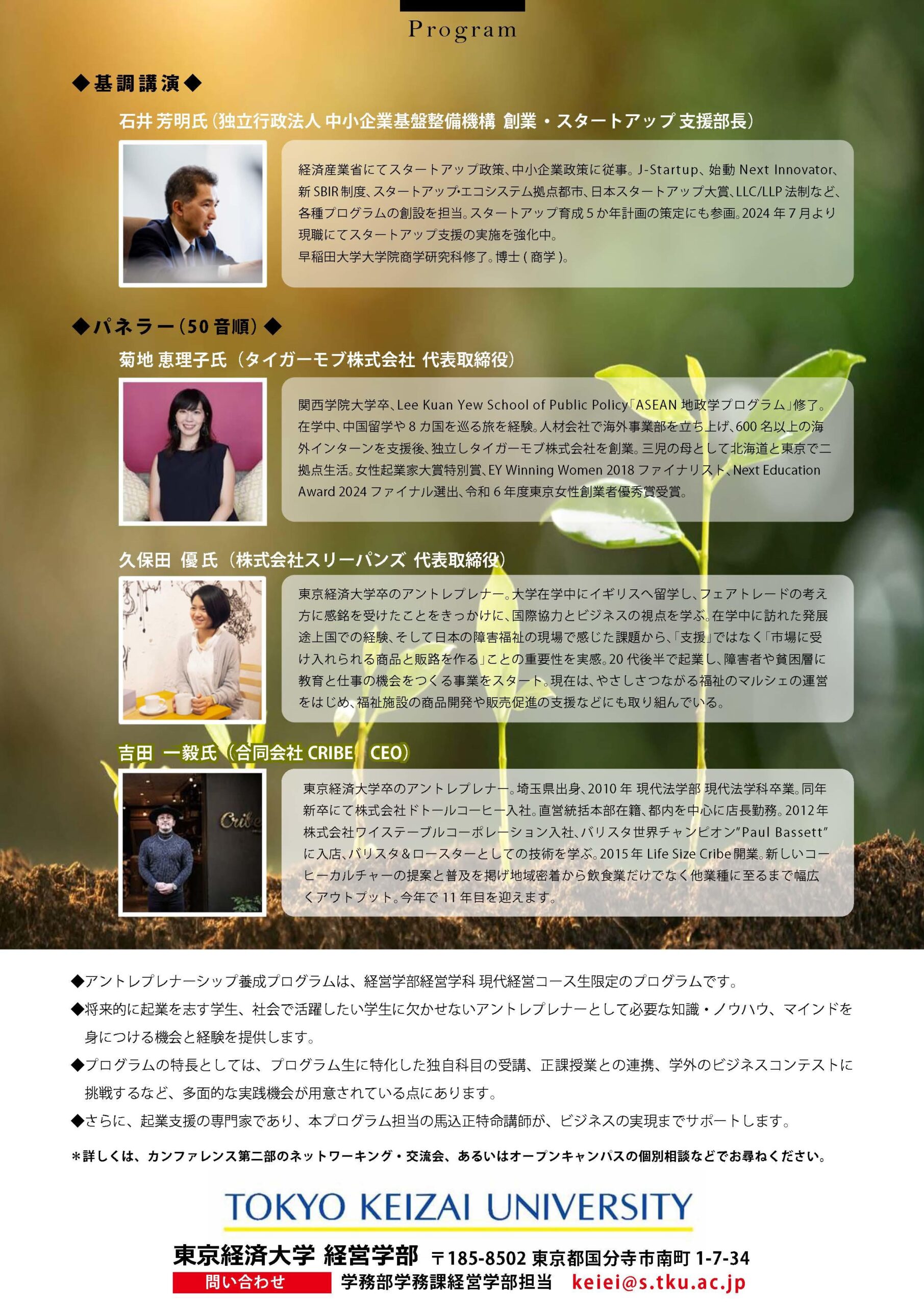 本プログラムの開設を記念し、独立行政法人 中小企業基盤整備機構 創業・スタートアップ支援部長の石井芳明氏らが登壇する創設記念カンファレンスを開催します。