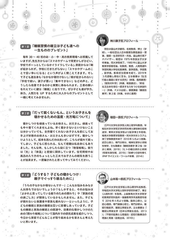 【後 援】日本睡眠改善協議会、公益財団法人神経研究所精神神経科学センター、日本睡眠学会、流山市、流山市教育委員会、柏市教育委員会
