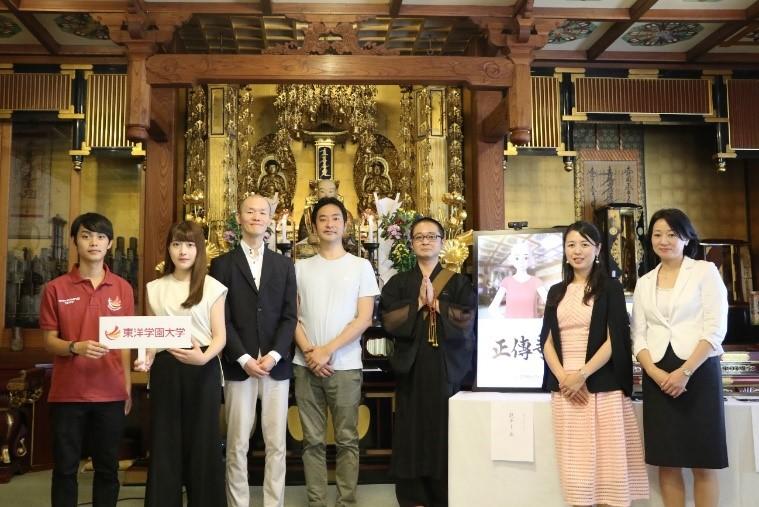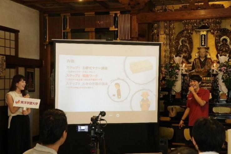 東洋学園大学(学校法人東洋学園 本部:文京区本郷 理事長:愛知太郎)現代経営学部の本庄加代子准教授(専門分野:マーケティング戦略・プロジェクトマネジメント)と同学部2年の田中陽太さんと高野亜美さんが、7月25日(木)に東京都港区で開催された正傳寺・お寺ステイ・大学との産学連携プロジェクトの共同記者説明会において、低迷するお寺市場の活性化を狙ったマーケティング施策のプレゼンテーションを行いました。