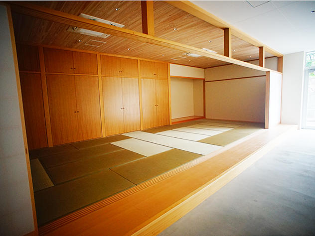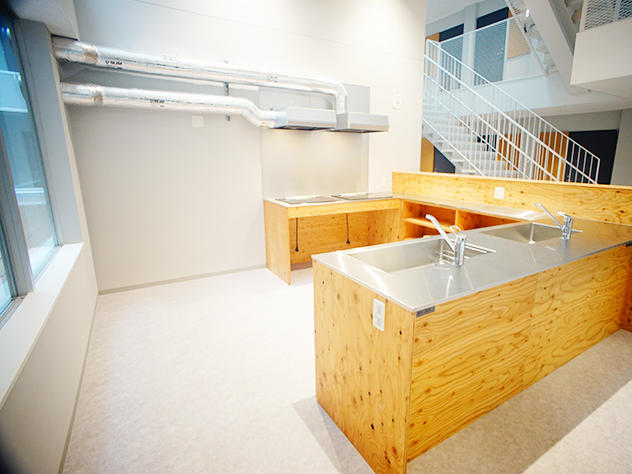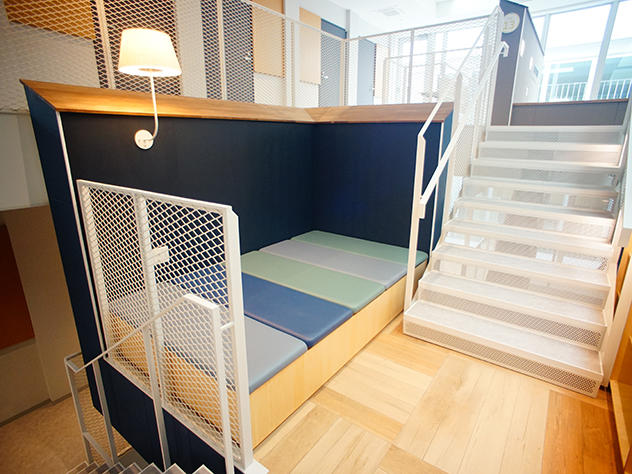 RS+S造、地上4階建、延べ床面積は6,065平方メートル。低層階には3つの多目的スタジオ・多目的和室や課外活動の部室などをテーマ別に配したワンフロアのストリート仕立てで、なだらかに丘陵地に溶け込む寮となっておいます。1階から4階までの吹き抜け部分には複数の階段を配置し、踊り場など周辺部分には少人数で作業や会話ができる「キッチンポット」や「人工芝ポット」「畳の小上がりポット」などのオープンな出会いのスペースを全館に約20個設置しています。