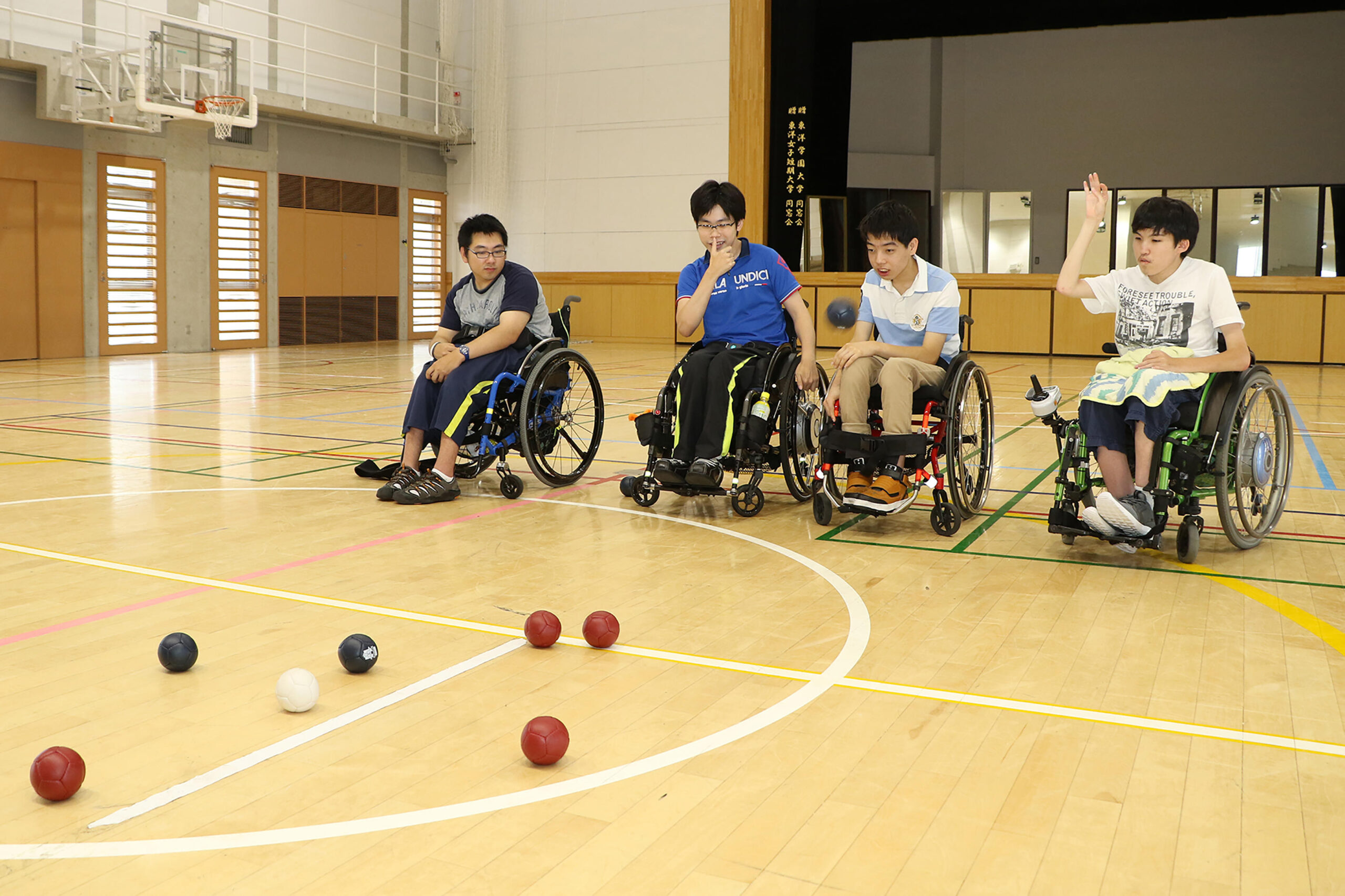 車いす使用学生がルールを説明しながら一緒にプレーします。