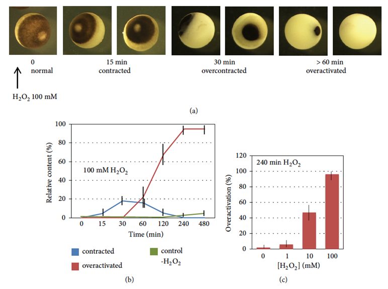 研究の結果、過酸化水素が濃度依存的に、アフリカツメガエル未受精卵に対してオーヴァーアクチベーション様の表層構造の変化および膨化をもたらすことを見出した。また、過酸化水素処理を受けた未受精卵内において、酸化ストレスマーカのリポフシンの増加、可溶性タンパク質量およびATP の減少が見られることも判明した。
