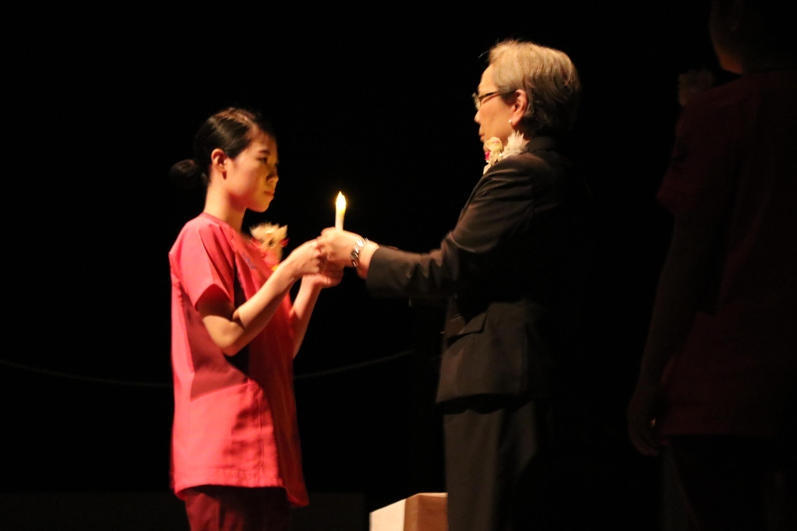 同大では、戴帽式に代わる儀式として「ナース・スチューデント認証式」を2016年から実施。基本的な看護技術試験をクリアしたことを認証する同大オリジナルの「認証バッジ」が一人ひとりに授与され、キャンドルサービスと学生たちが自ら考えた「誓いの言葉」の宣誓が行われる。