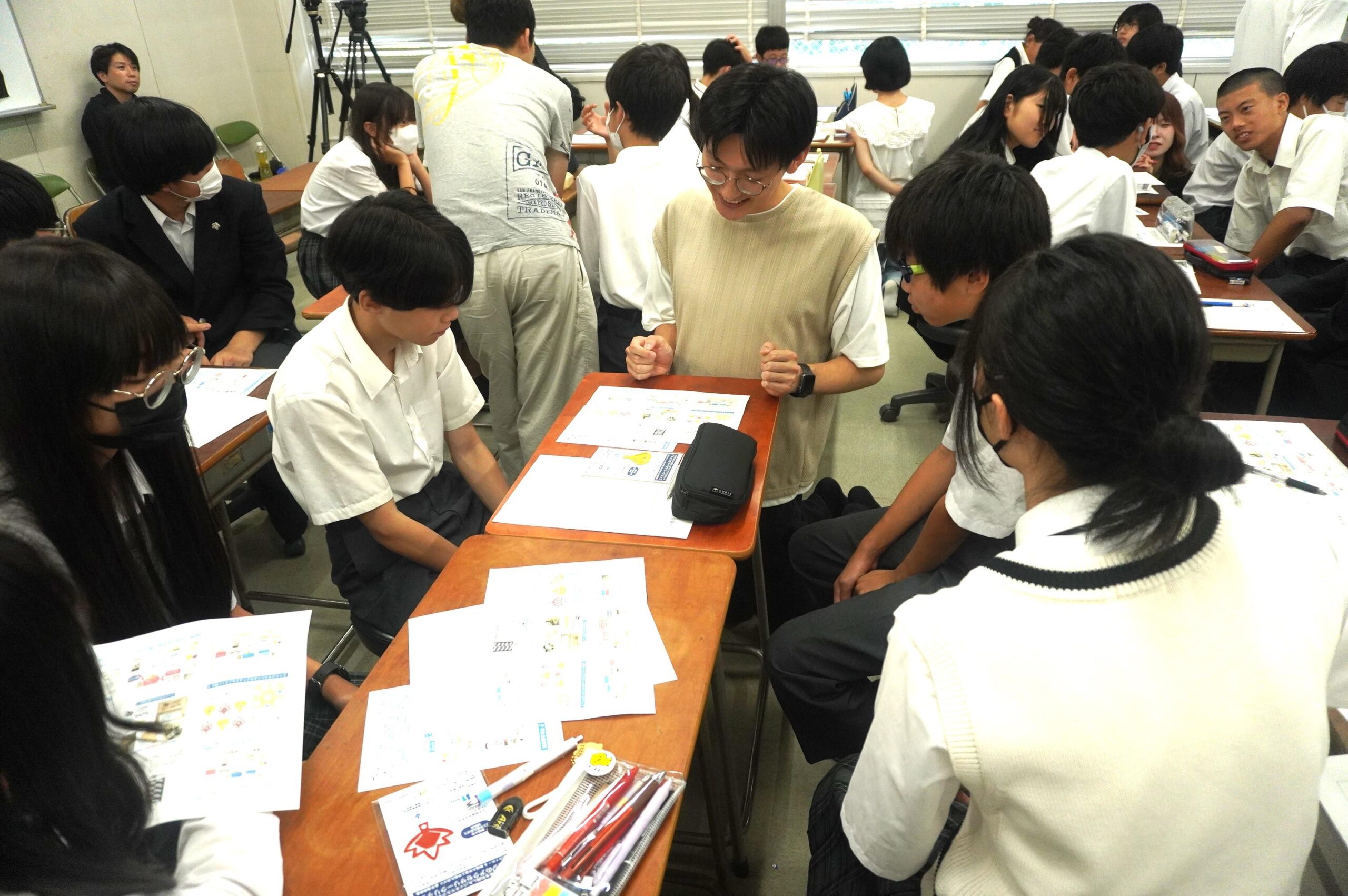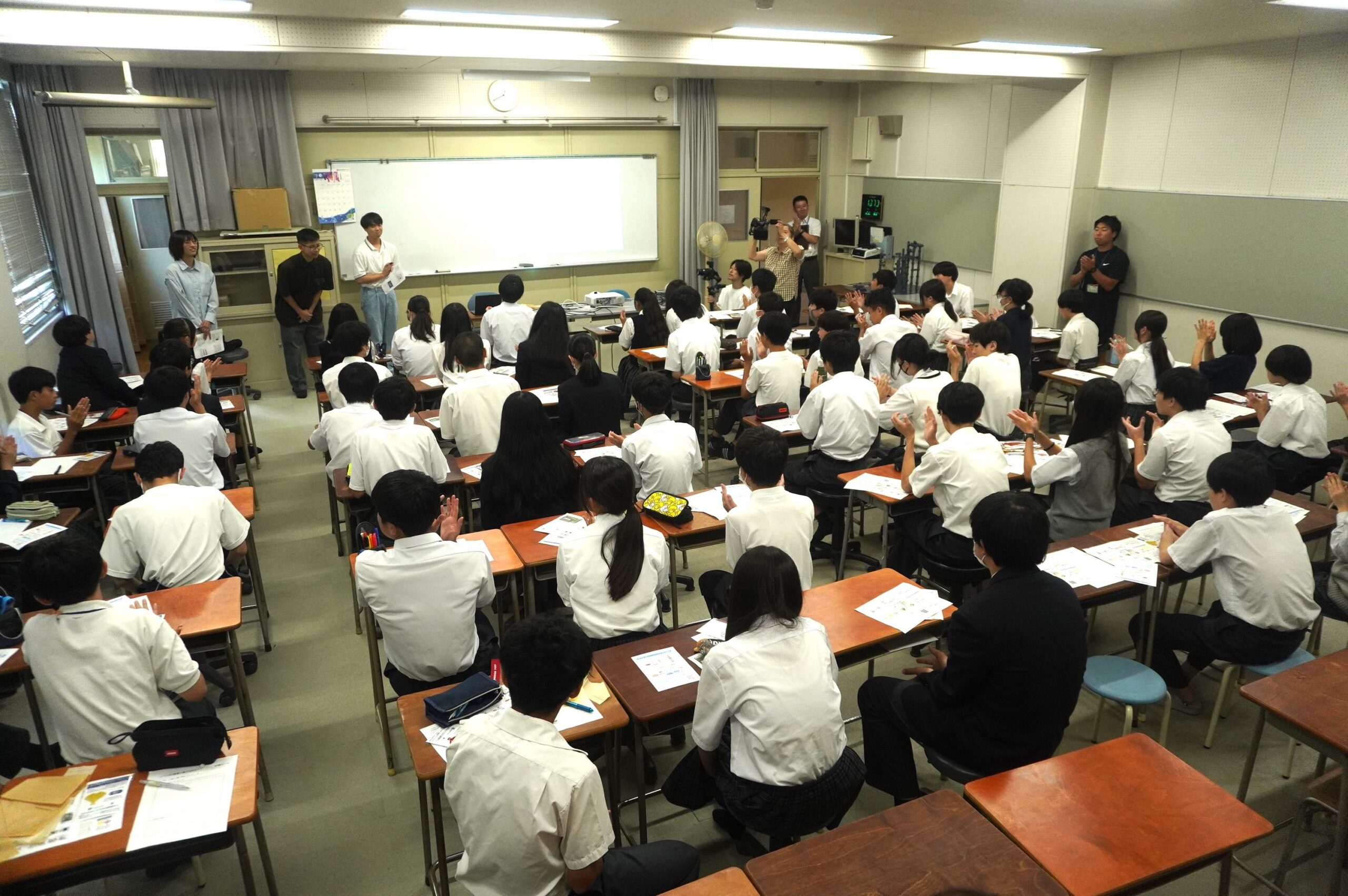 今回は八王子市立南大沢中学校にて、創価大生による特別授業を実施し、STEAM教育のモデル事業であるゼミの取り組みや製品の開発プロセスなどを紹介しました。また、丸田ゼミが開発した米粉バイオマスプラスチック製のイチョウとモミジのクリップ(八王子市章入り)を試供品として配布しました。その後の給食では、「食べられるスプーン」の試供を行い、SDGsの視点から食品ロス削減や地産地消の意義について中学生らと考えを深めました。