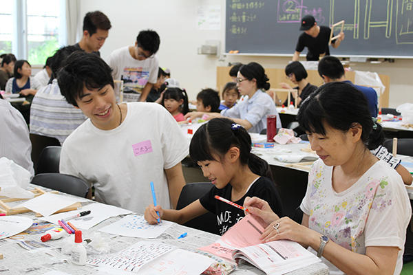 ・行灯製作イベントでは、アーティストのフジシロリョウ氏、同大政策情報学部生によるワークショップを開催。子ども達とともに、巨大行灯の側面を飾るアート、祭りのPRのためのミニ行灯の制作を行う。