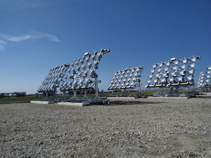 ■これまでの架台固定式では東西に架台が固定されている事が多く、朝方、特に夏季に太陽が北寄りから昇り、発電パネルが太陽の影に入り、発電できない不具合があった。これに対し開発を行った10 フィートコンテナでは基礎となる下部と可動部となる上部に分割可能な構造とし、上部は太陽の方向に回転、パラボラユニットも仰角駆動を可能とした2軸追尾システムを構築し、太陽の動きを完全に追尾できるようにする。これにより架台式シリコン系発電システムに比べ、年間発電量が最大2倍近く得ることが可能となる。