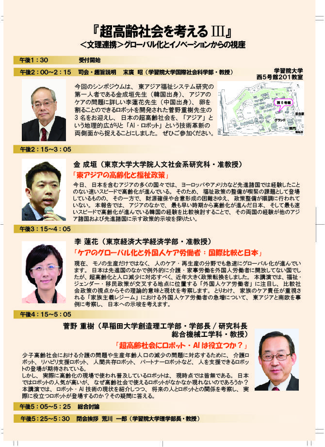 学習院大学が6月29日にシンポジウム「『超高齢社会を考えるIII』– グローバル化とイノベーションからの視座 –」を開催