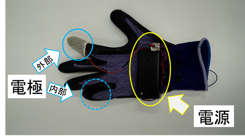 手袋型のデバイスを着用することで、人差し指部に取り付けられている電極からスプーンやフォーク、コップ等の金属製の食器を介して、舌に電気味覚を付与します。これにより、気軽に飲食物へ電気味覚を付与した食事をすることが可能です。