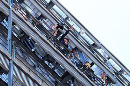 コンテスト途中から風が吹き始め、落下途中の緩衝器があおられて階下のバルコニーに”不時着”するハプニングも。